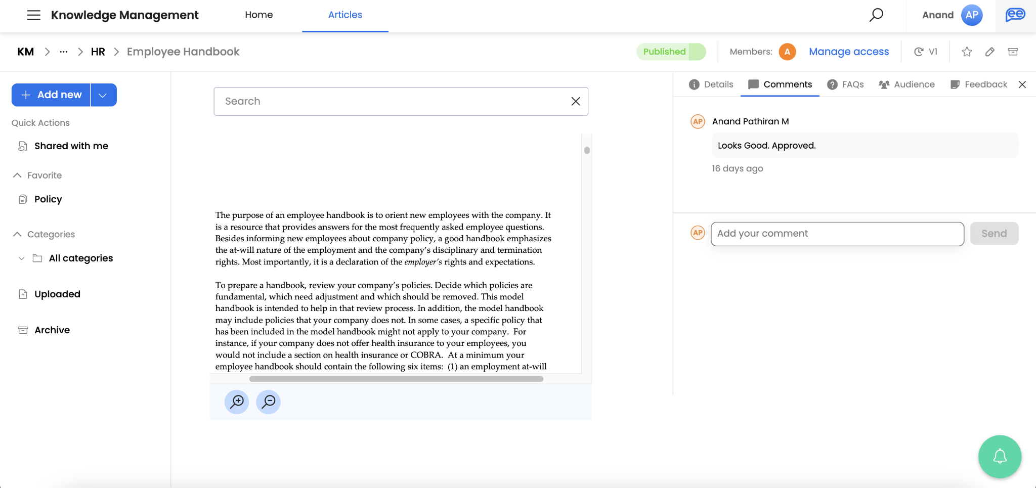 - Article owner: Can edit, comment, archive, and reply to feedback given for articles.