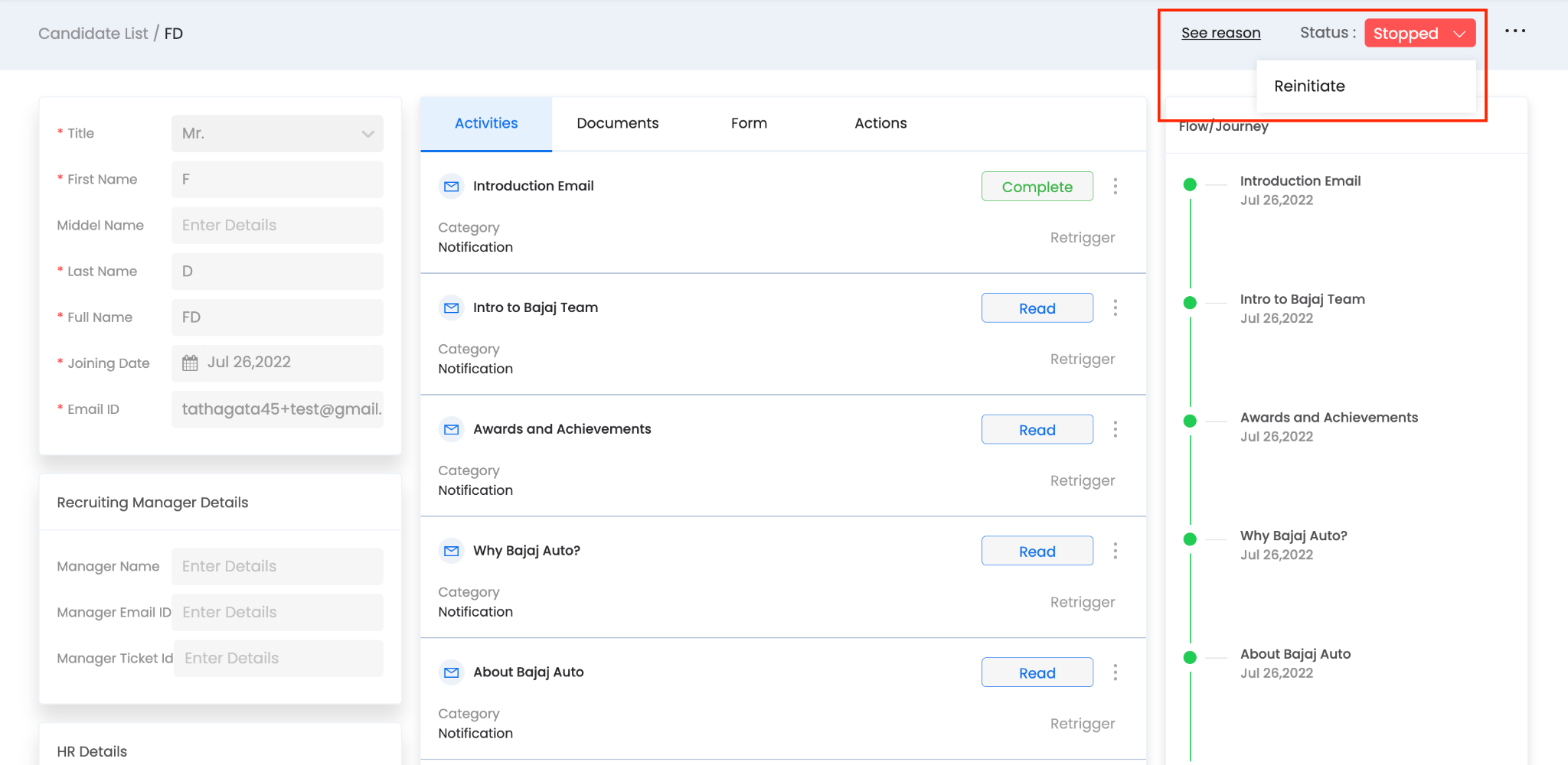 Depending on the status of the candidate’s application, the admin has the access to re-initiate onboarding of the candidate if it was paused or revoked, as well as marked as ‘complete’ if they stop the application.