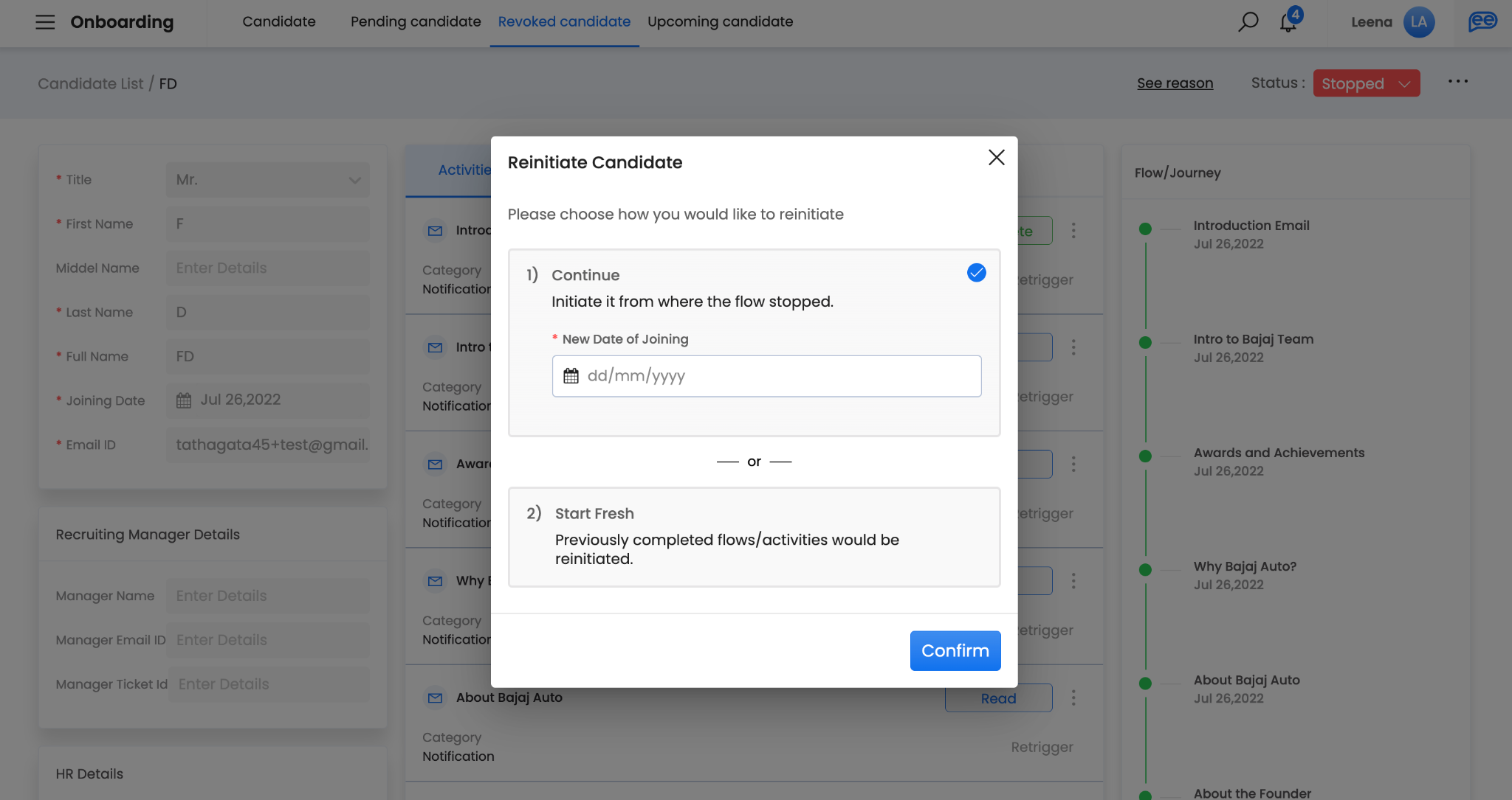- Starting the onboarding from scratch - Selecting this option will retrigger all the activities on the new trigger dates as per the new date of joining. The data filled under the forms, and documents submitted would remain saved under the candidate’s profile and can be overwritten if required.
