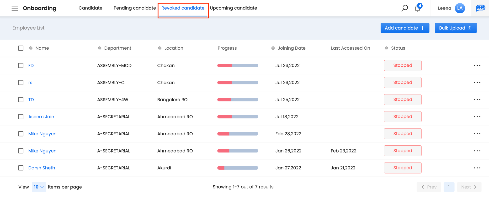 Navigate to the ‘Revoked Candidates’ list, and search for any specific candidate with the stopped/revoked onboarding.