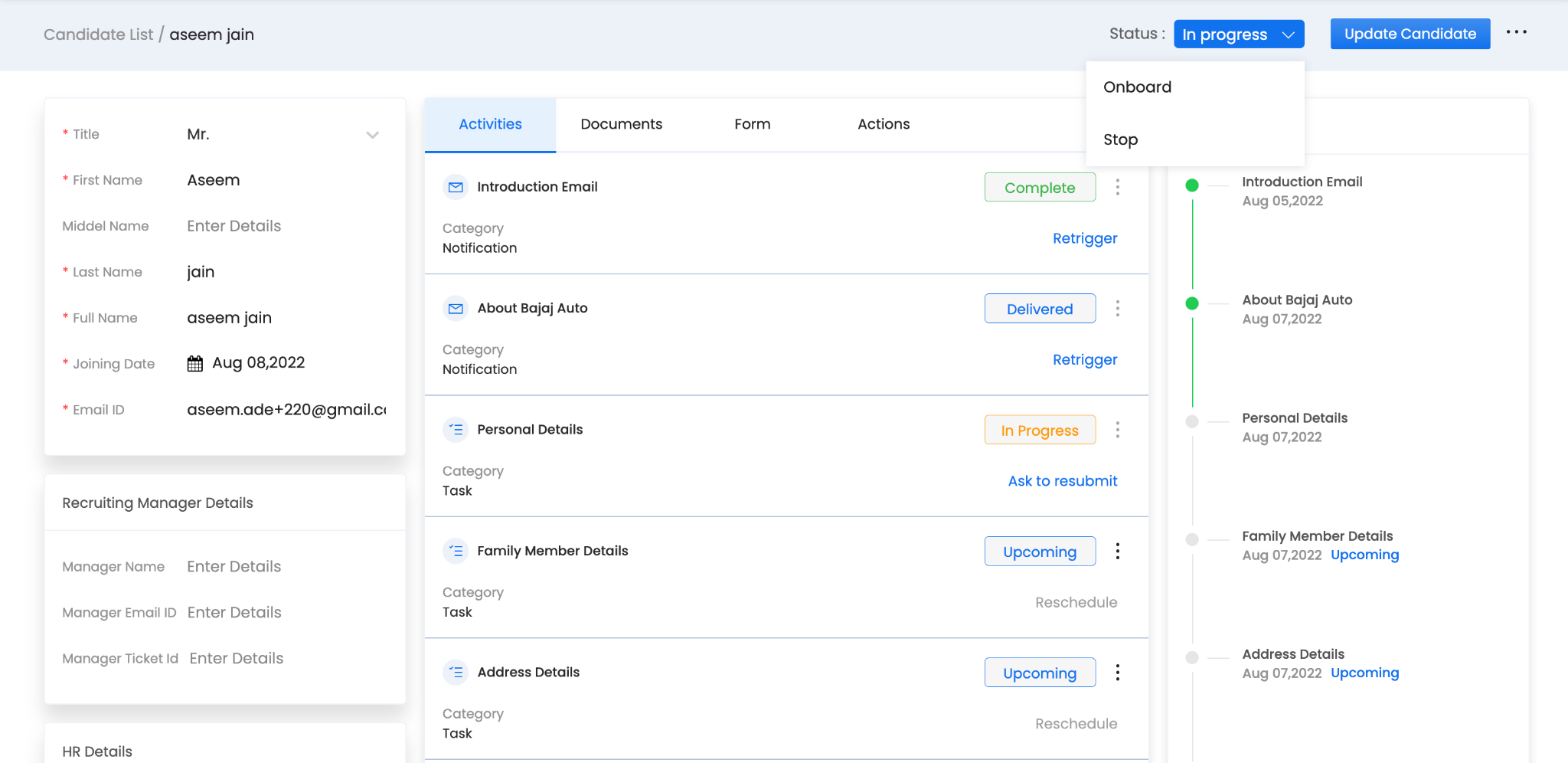 In the candidate’s profile, change the onboarding status as ‘Onboard’ to complete the onboarding, or ‘Stop’ to stop/revoke/cancel the onboarding of the candidate.