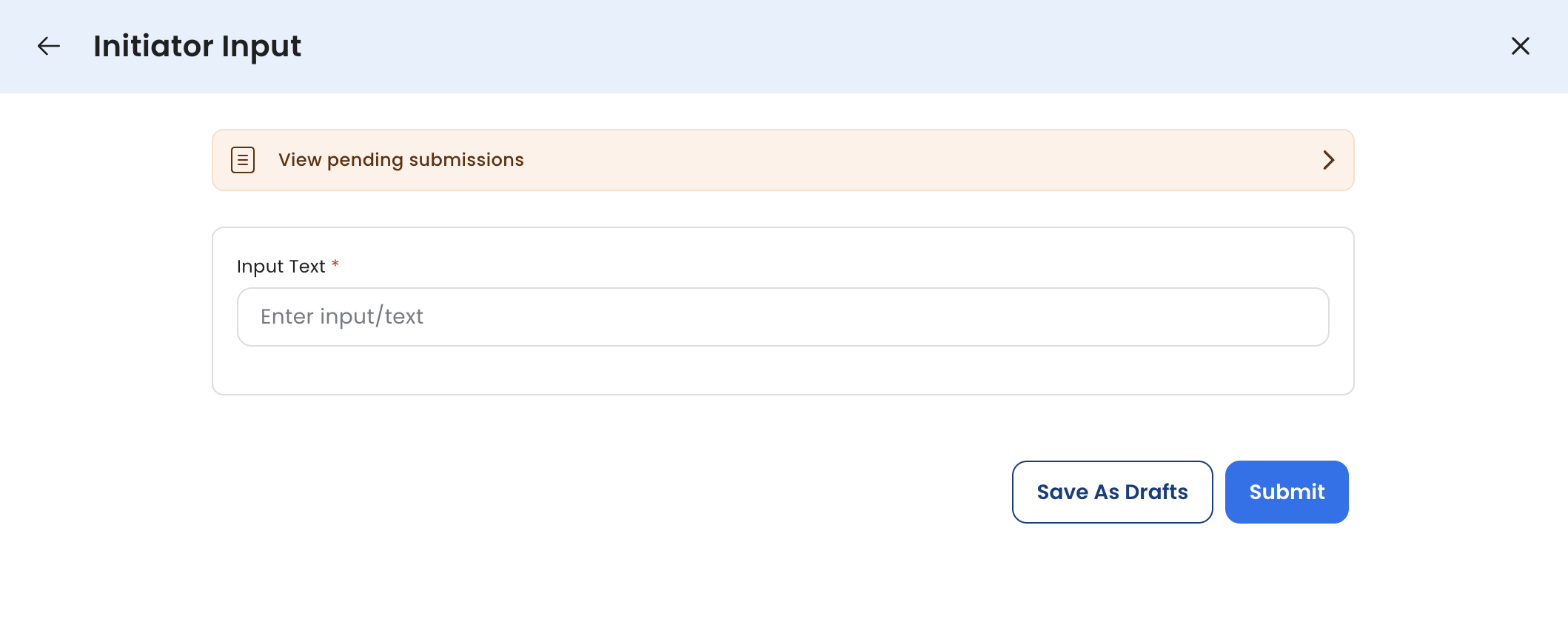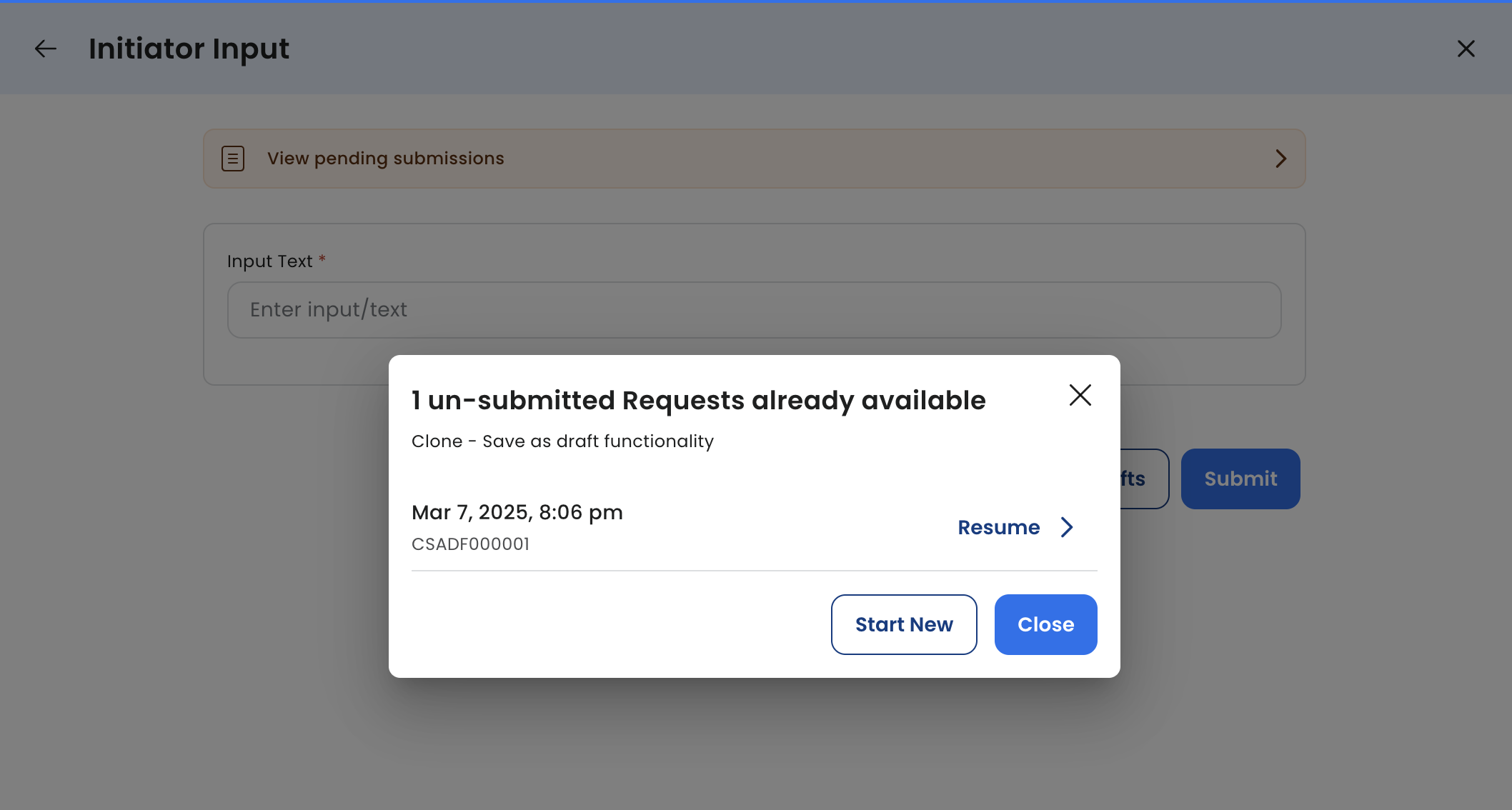 In such a scenario, we show a banner to the user under the initiator input step, which allows the user to view the list of pending submissions and resume any of the pending requests.
