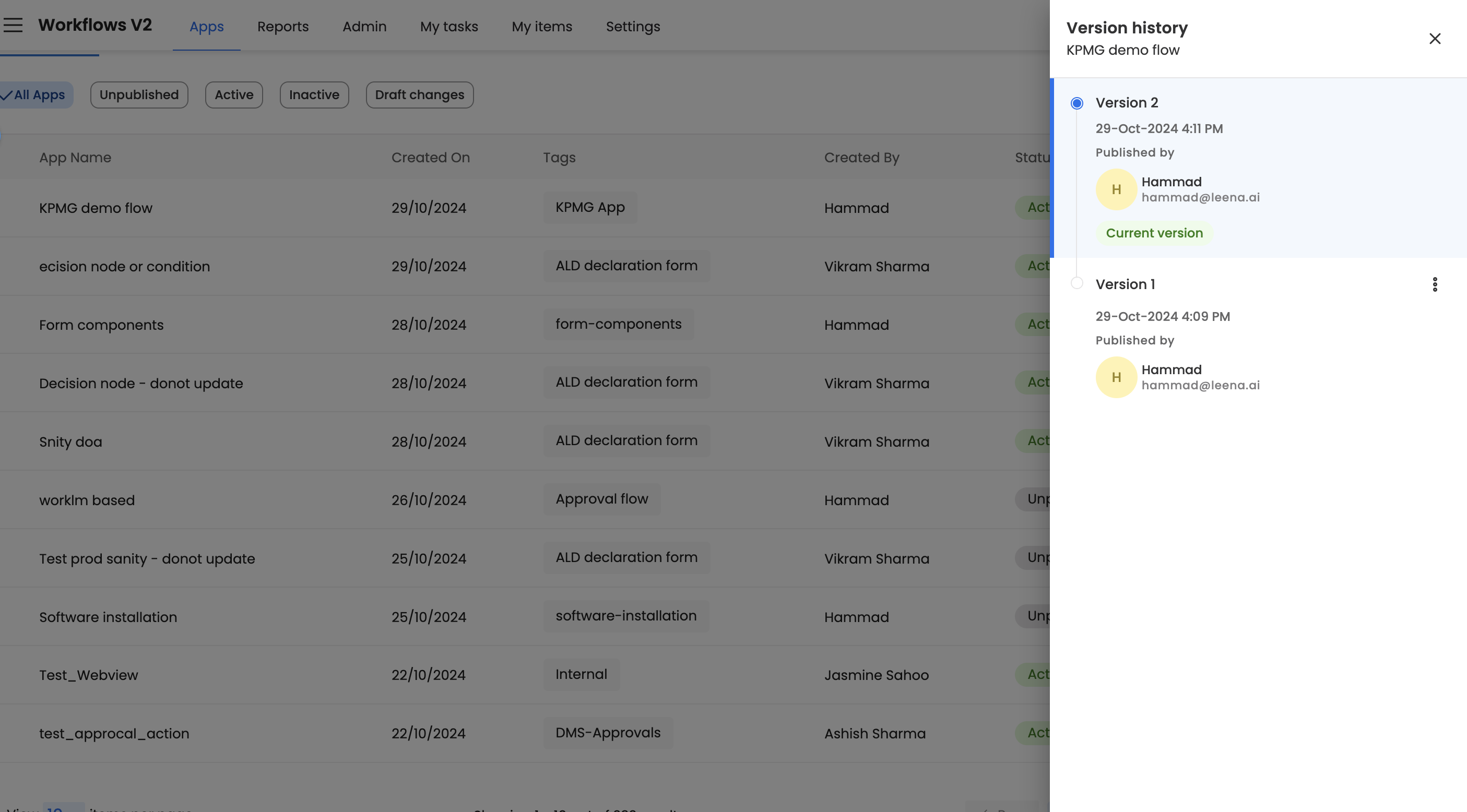 Once the user clicks on 'Version History, the logs around historic published versions open in the side sheet.'