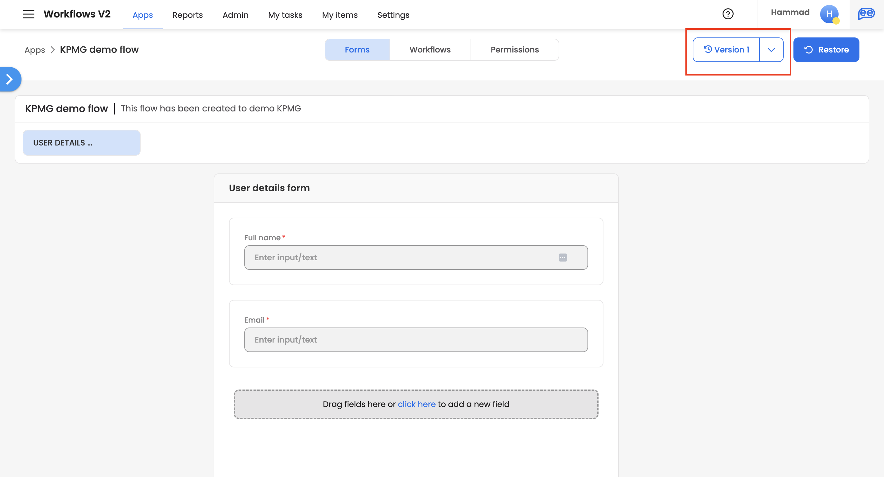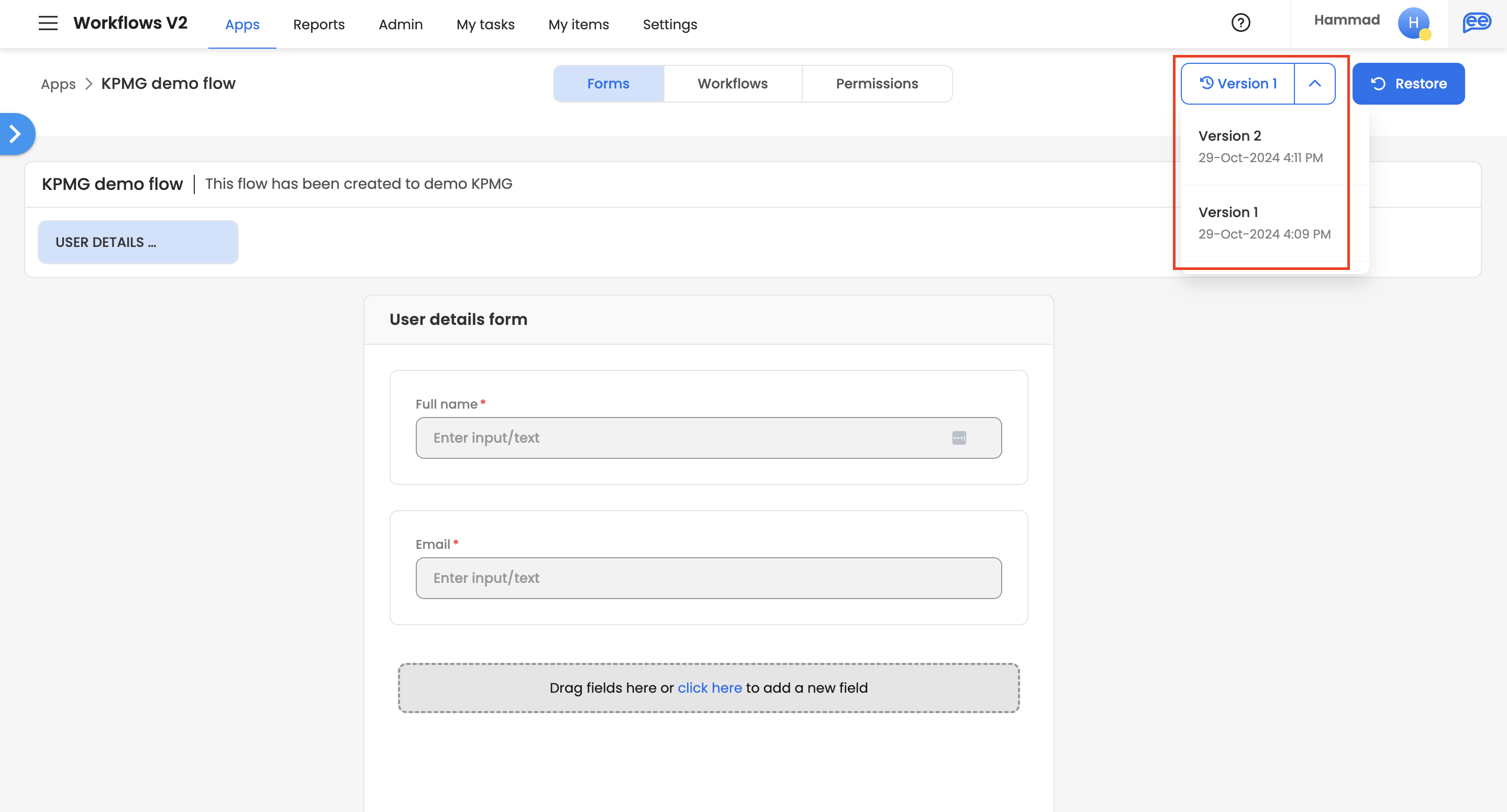It can also choose to 'Restore' version, which would create a new draft version of the application as per the Restored version.