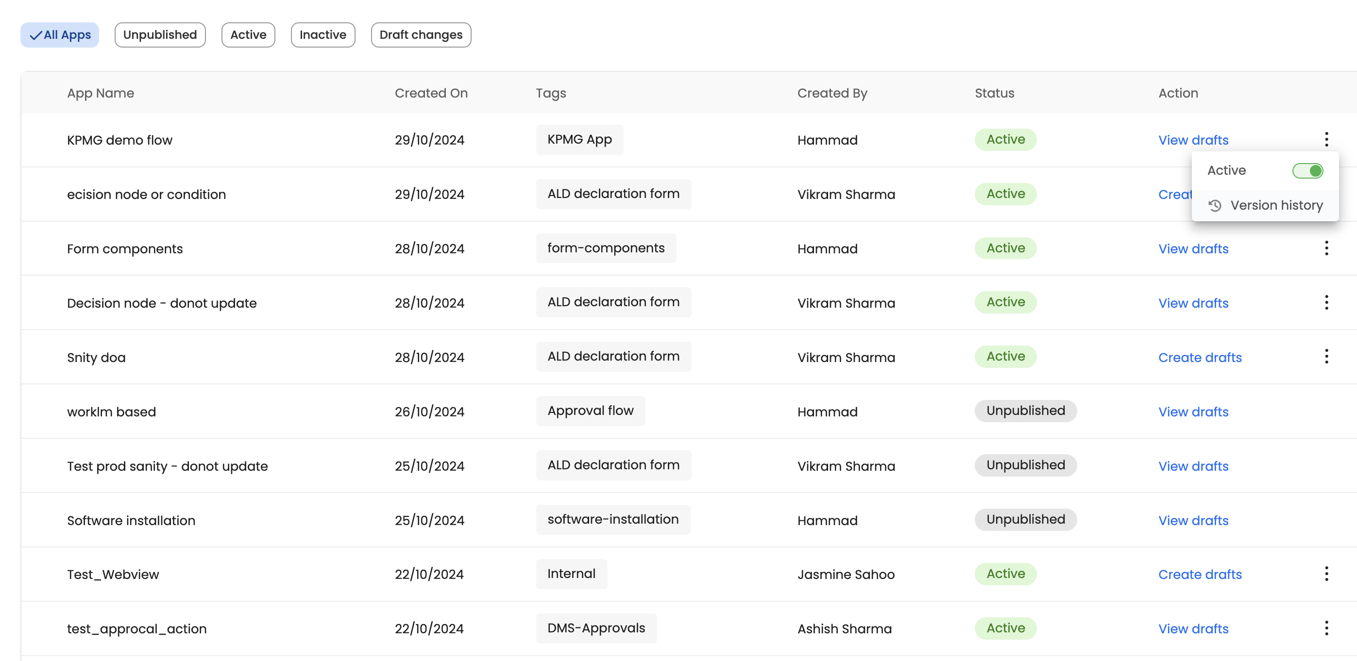 The user can access the version/s history against an application, by clicking on three vertical dots.