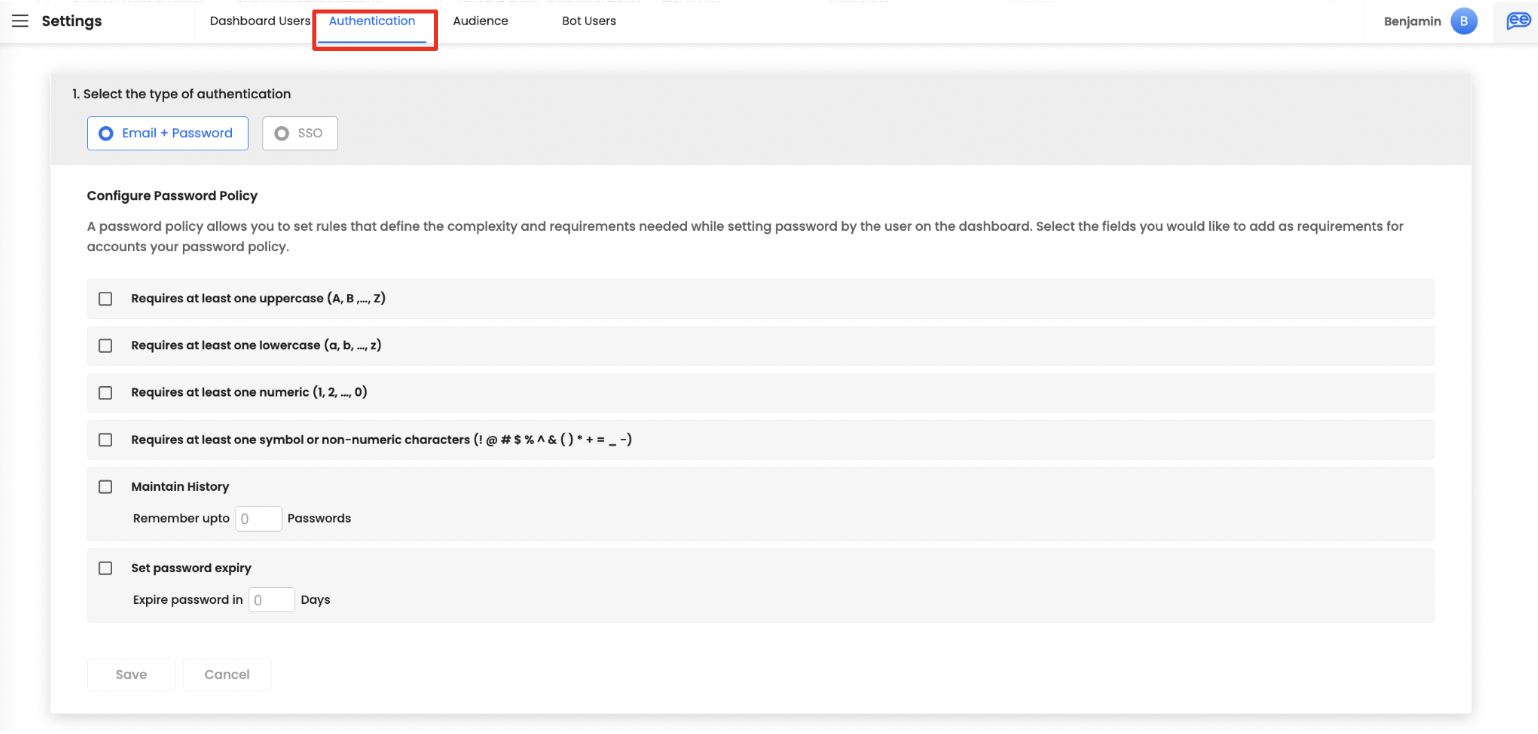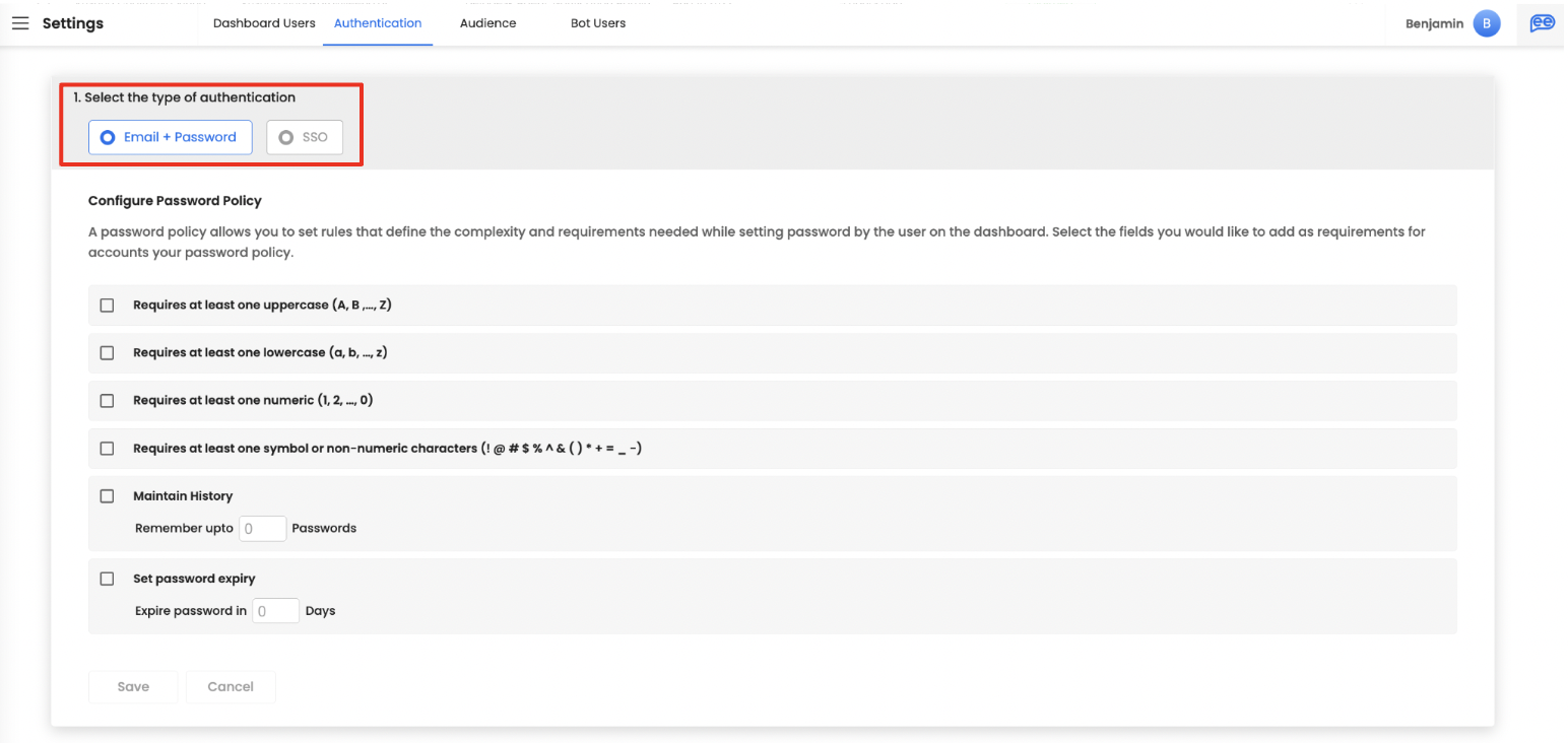 Email & Password: Opt for password authentication via email and configure password parameters for users to follow