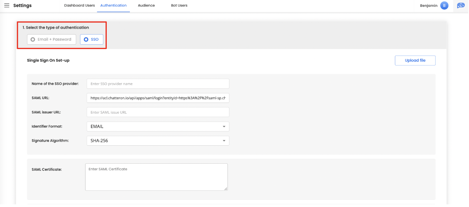 SSO - Single Sign On: Set up SSO along with SAML configuration by tapping on the ‘SSO’ switch and filling the details.