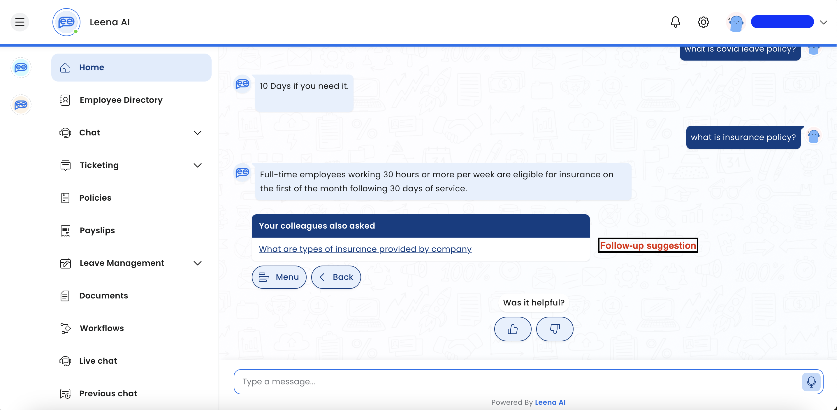 After responding to a user's query, LeenaAI extends the interaction by recommending further inquiries that could be relevant. This feature is designed to deepen user engagement and provide a more comprehensive exploration of topics.