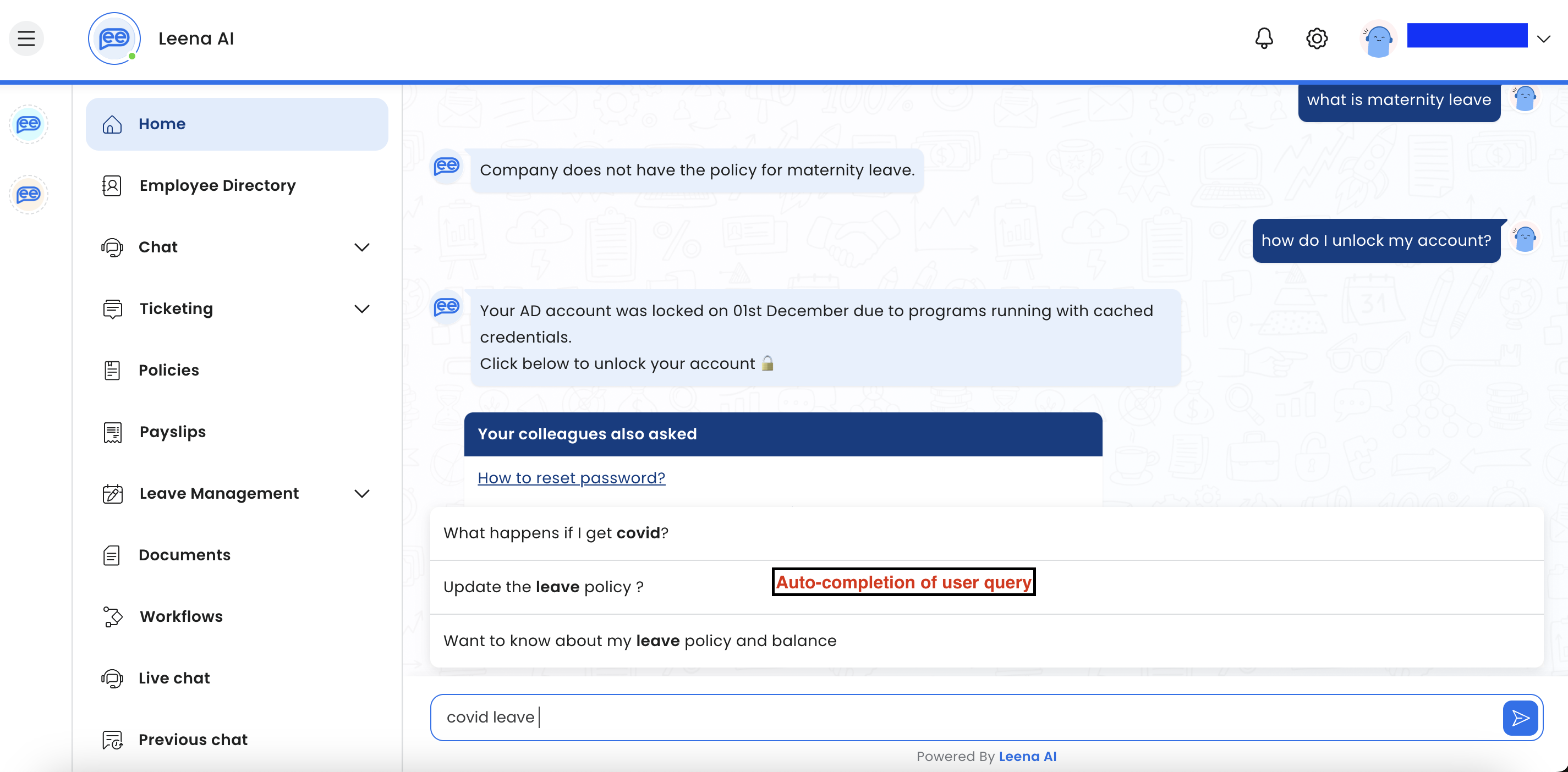 - Basis of Prediction: The system leverages a comprehensive knowledge base where various types of questions are cataloged. When a user begins typing a query, LeenaAI matches the initial words of the query against this database.