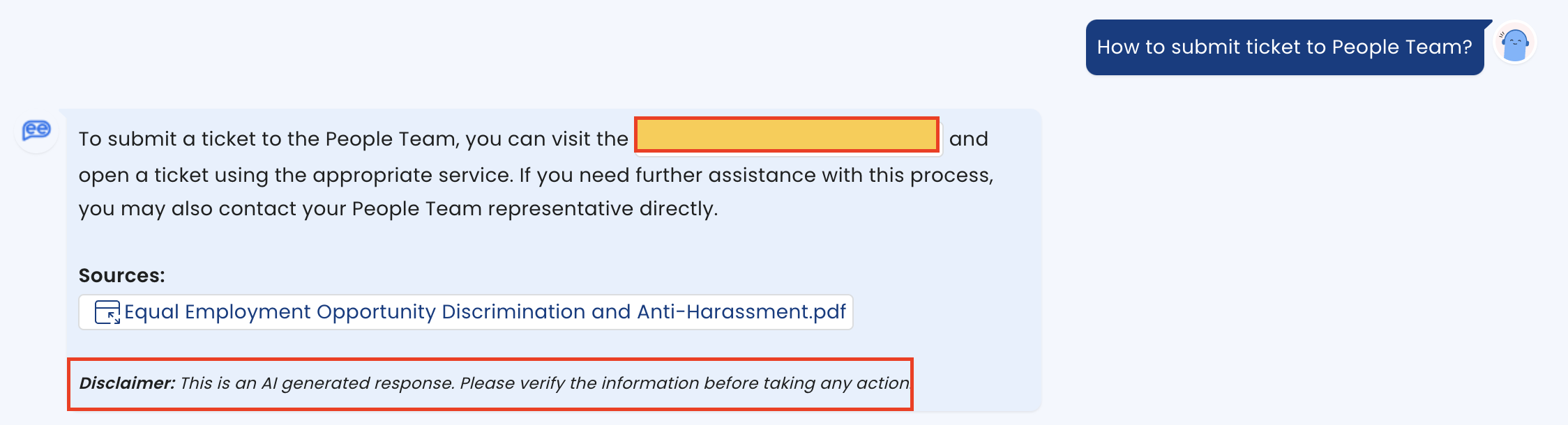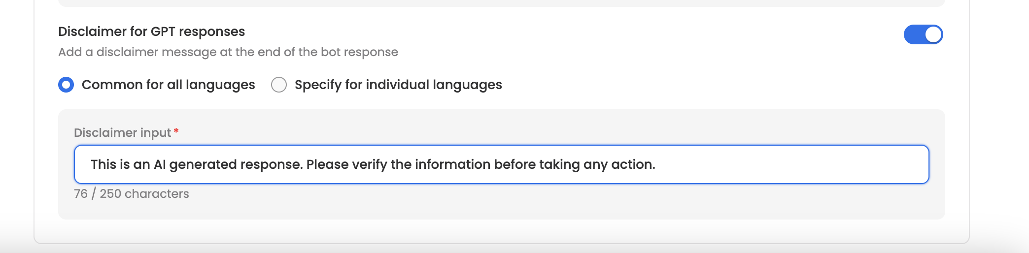 Note: The disclaimer message will be shown in the bot after every WorkLM response. Users can also define different disclaimers for different languages.