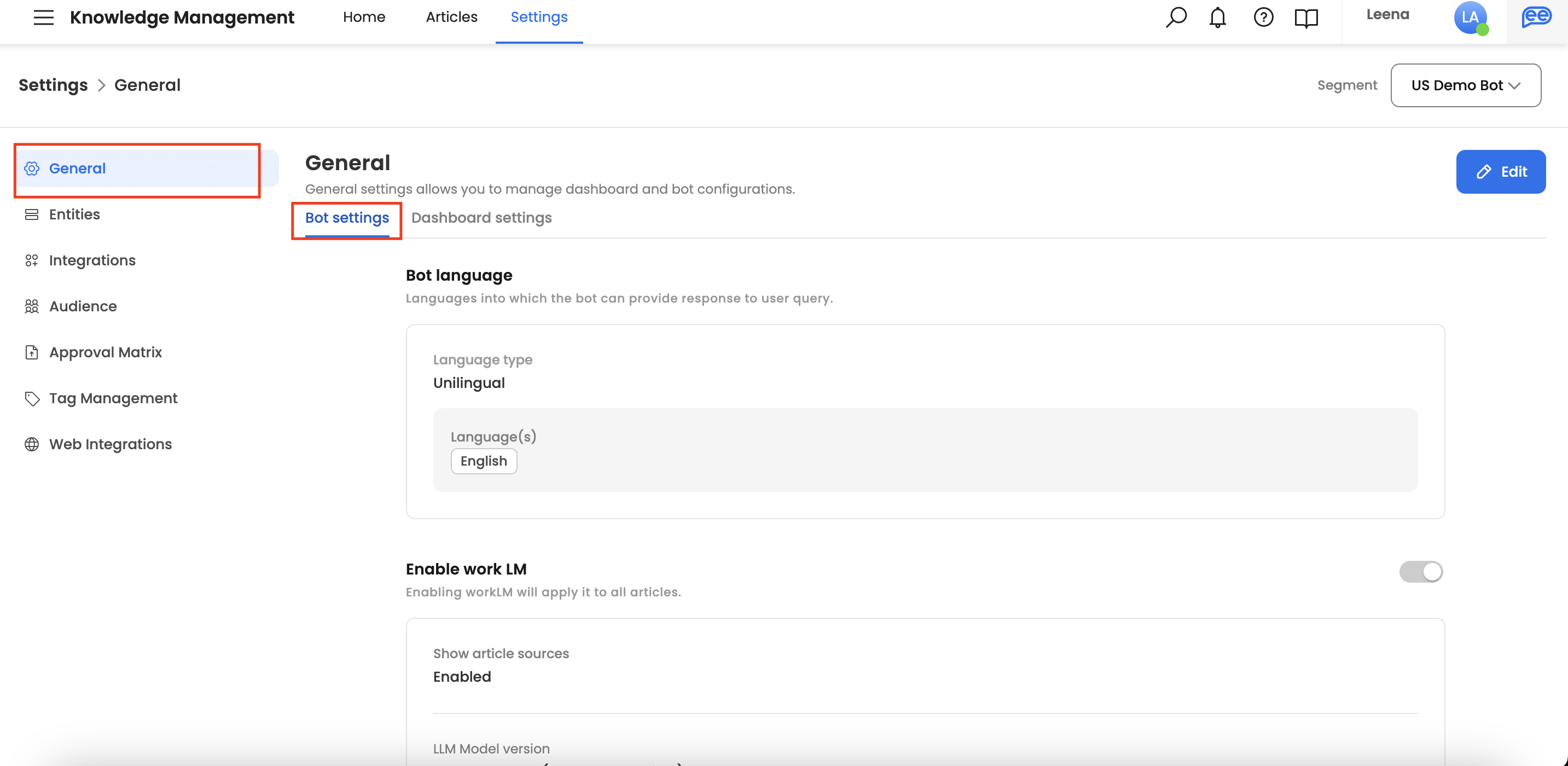 Users can now manage WorkLM configurations directly from the KM dashboard. Enabling WorkLM transitions the bot to an LLM-based model for generating bot responses. You can read more about WorkLM here.