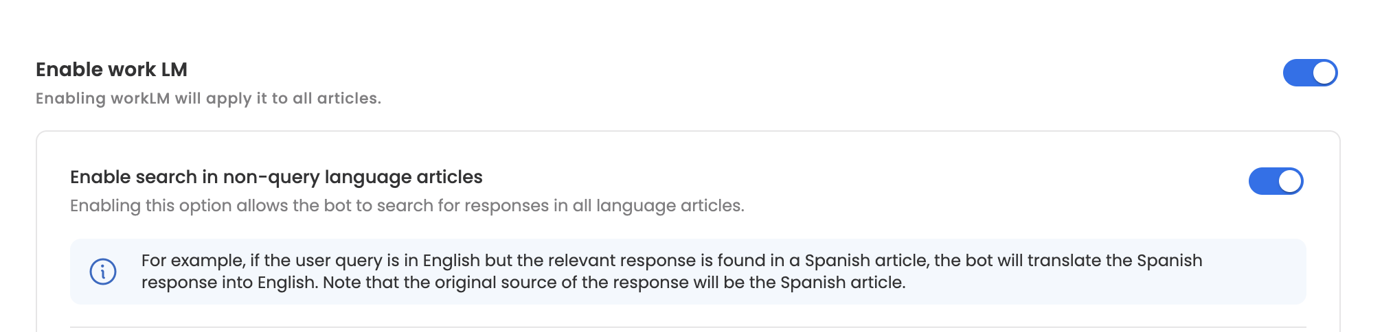 - For example, if the user query is in English but the relevant response is found in a Spanish article, the bot will translate the Spanish response into English. Note that the source of the response will be the Spanish article.