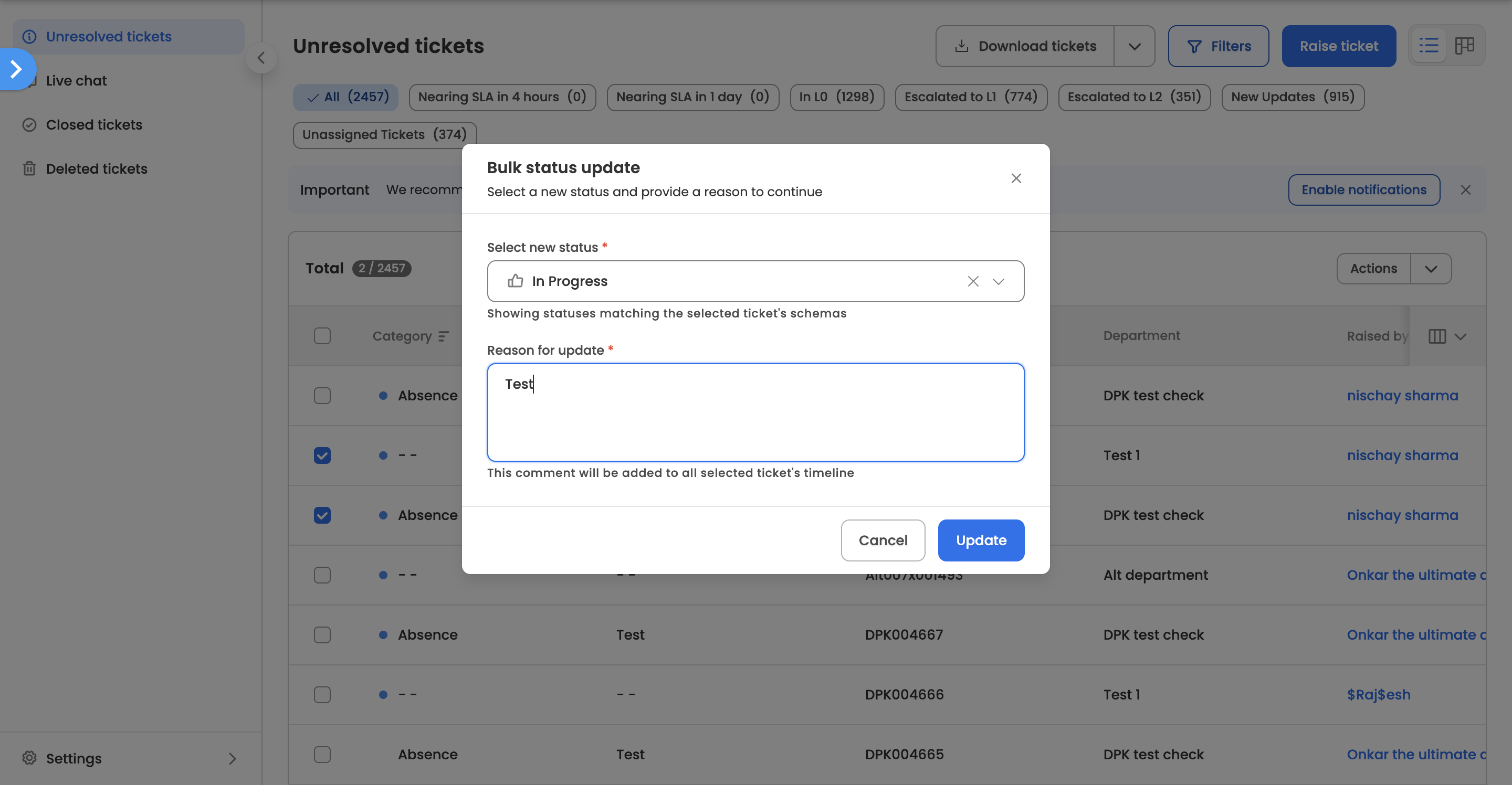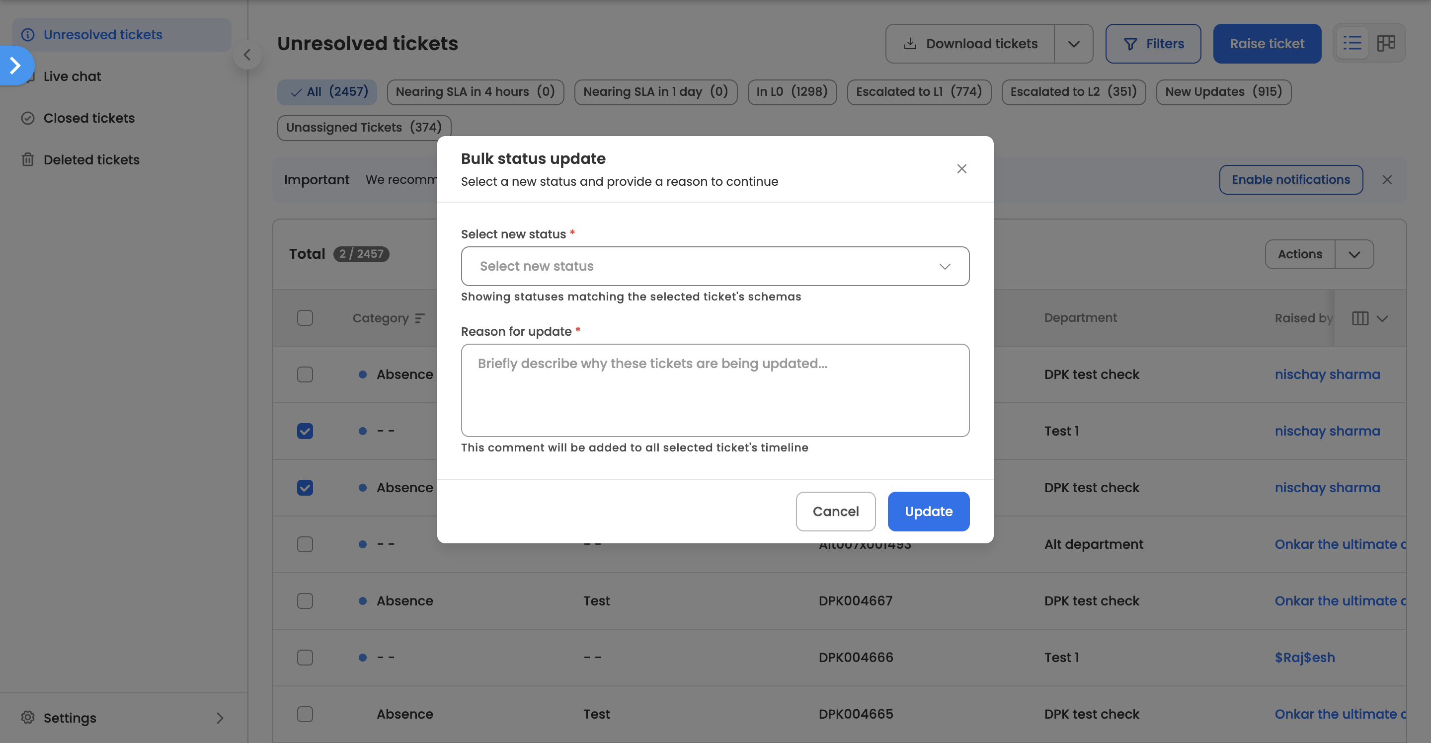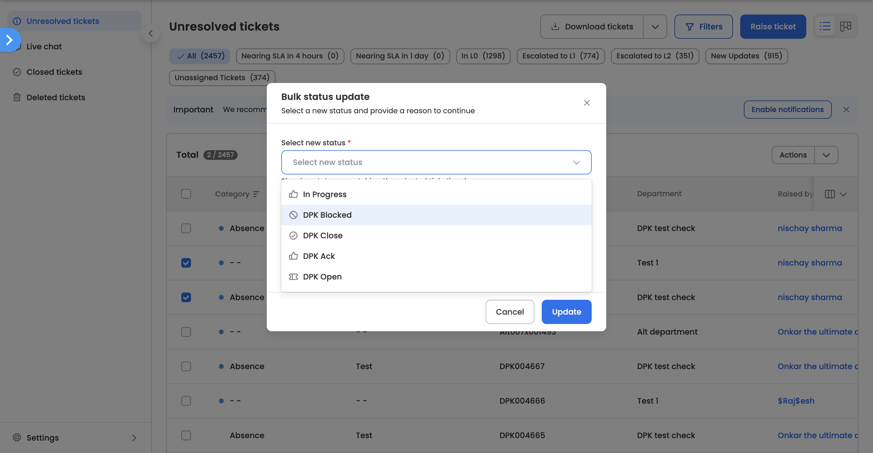 - All selected tickets will be updated to the chosen status