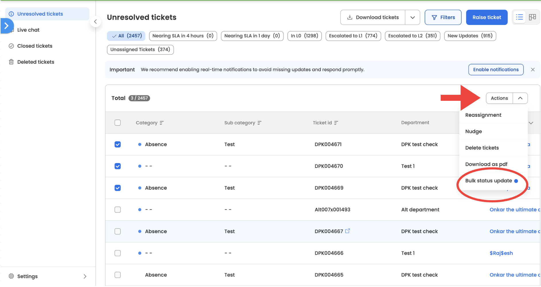 - Bulk updates apply the same status to all selected tickets
