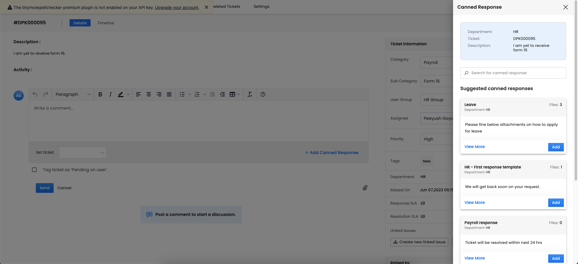 Canned responses serve as a time-saving feature and help ensure consistency and accuracy in employee support or communication. Instead of typing out the same response repeatedly, support agents can use canned responses to provide prompt and consistent replies to employees.