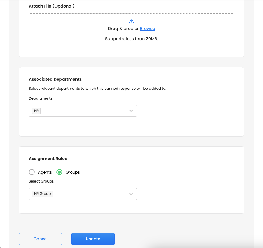 - Associated Department - This field links the canned response to a specific department. The admin has the flexibility to choose the associated department.