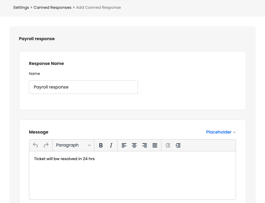 By configuring these settings, you can create a new canned response that can be easily selected and used by agents when responding to customer tickets. The predefined message and placeholders help ensure consistent and efficient communication, saving time and effort for support teams.