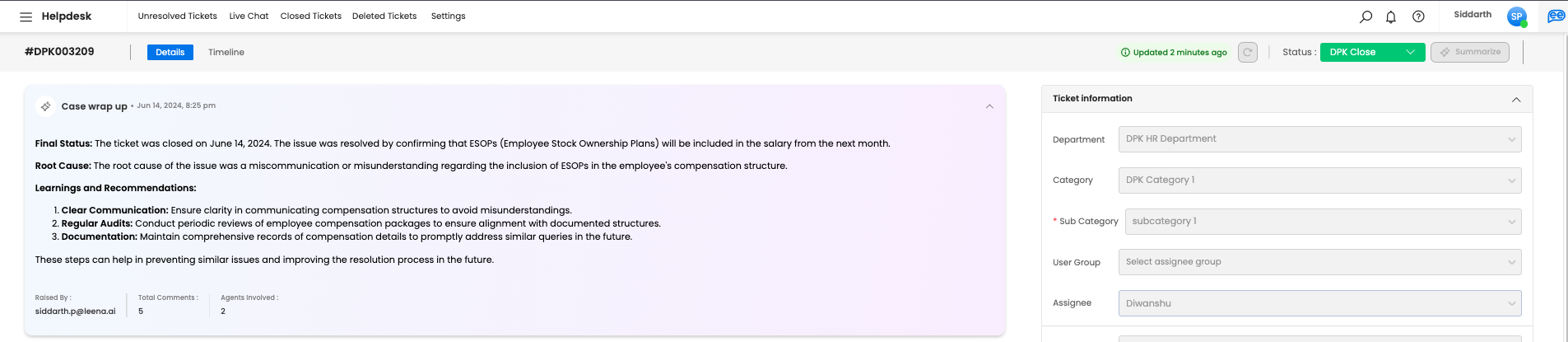 Leena AI helpdesk is enabled to provide an AI generated case wrap-up summary for resolved/closed tickets and a case summary for open tickets.