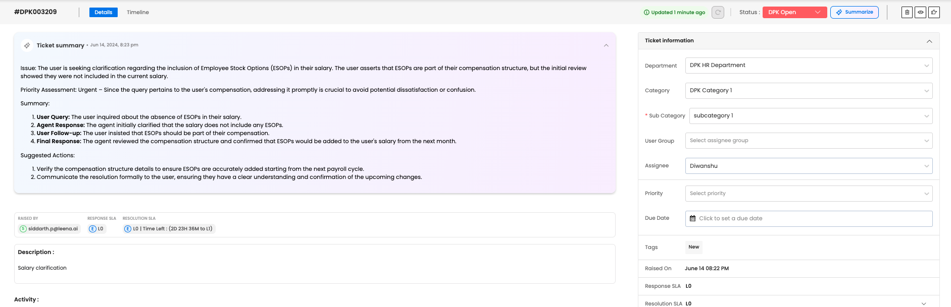 Please note that the summary does not auto-update on further activity but can be regenerated any number of times till the ticket is closed. Post ticket closure, a summary cannot be generated/updated. It will be shown upto the point it was last generated by any agent working on the ticket.