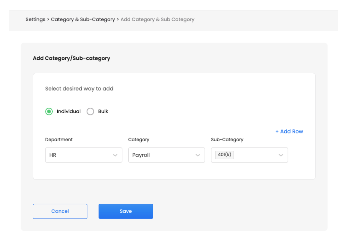 Add a category or subcategory individually by simply selecting the department(s) it should be associated with and enter the name of the category in a separate input box. Clicking on the "+ ADD" icon adds the category to the list. You can add multiple categories using the same process.