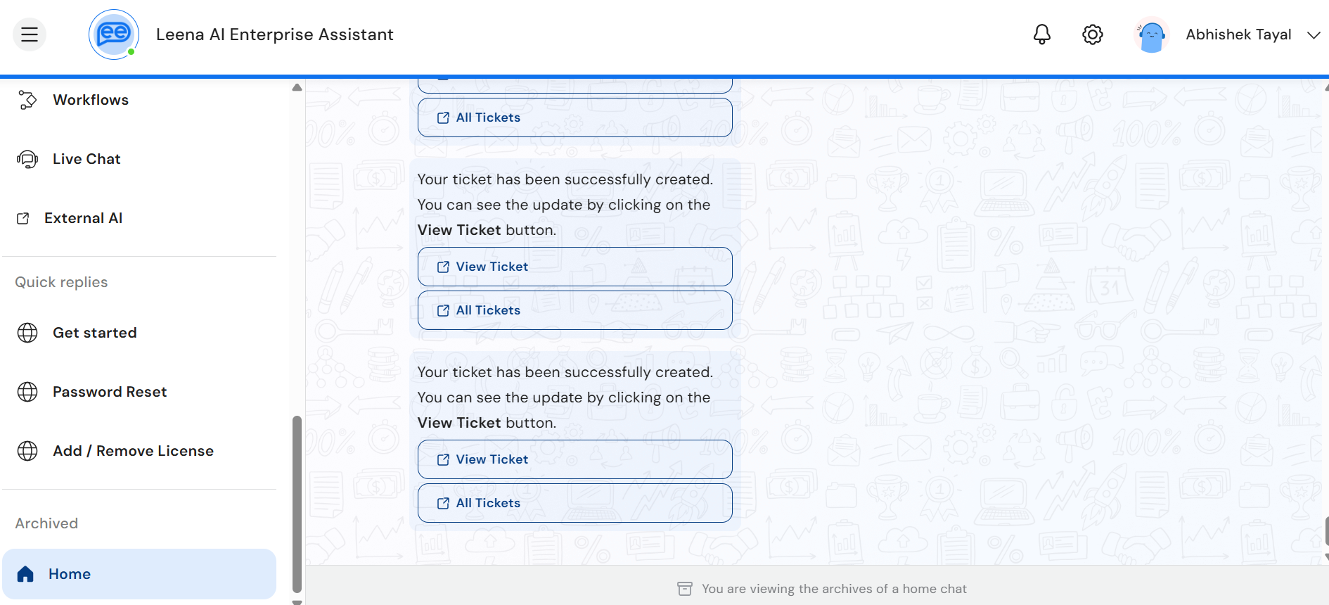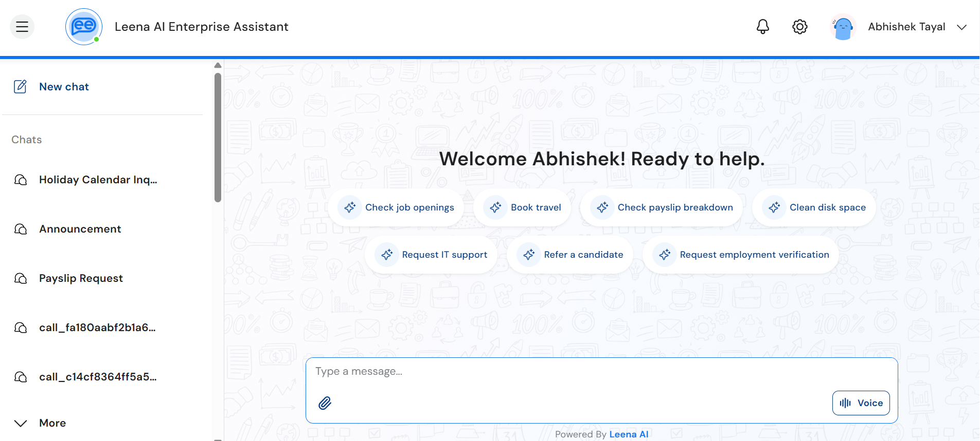 The Chats feature allows you to have multiple, parallel conversations with the Leena AI virtual assistant.