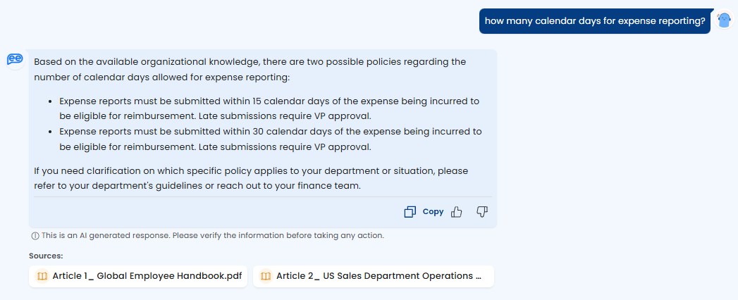 Performance: Enabling Conflict detection adds an additional processing step to the pipeline, which may slightly increase response latency but improves accuracy in complex datasets. Below is a sample response to a query having conflicting information in the enterprise knowledge