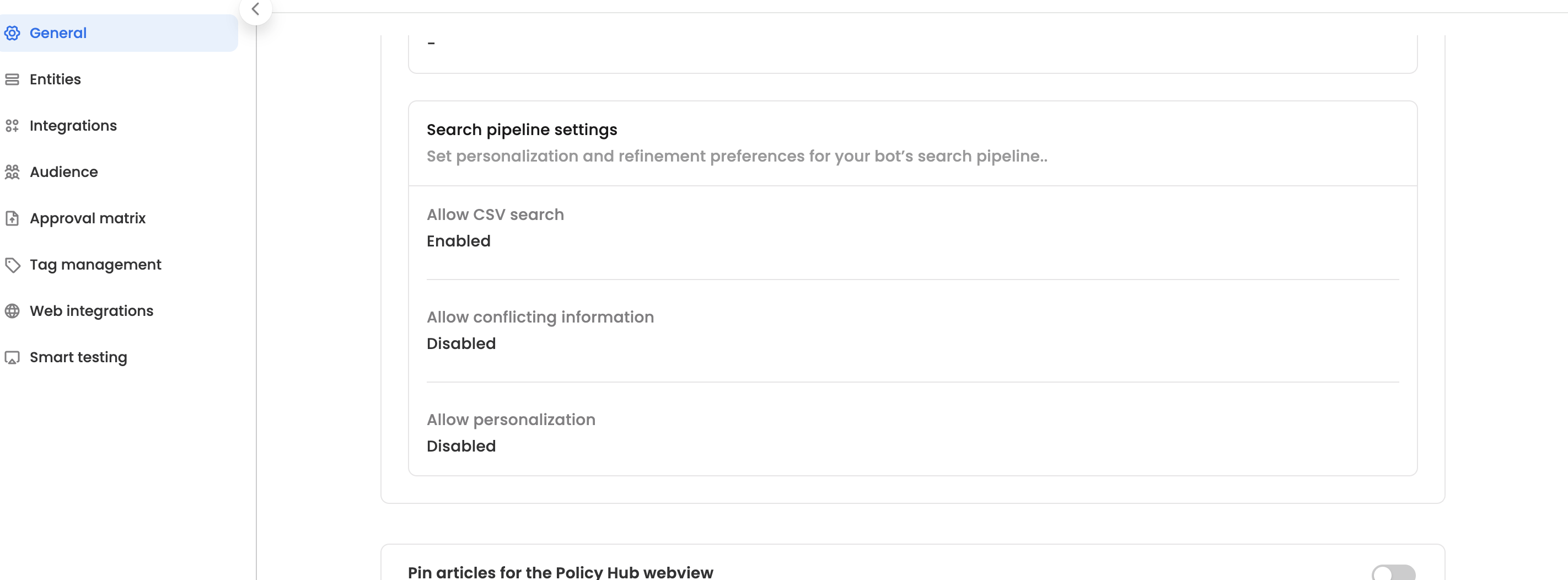 | Allow personalization | OFF | Allows the bot to tailor answers based on user details (e.g., giving a different answer regarding "Benefits" to a generic employee vs. a manager). |