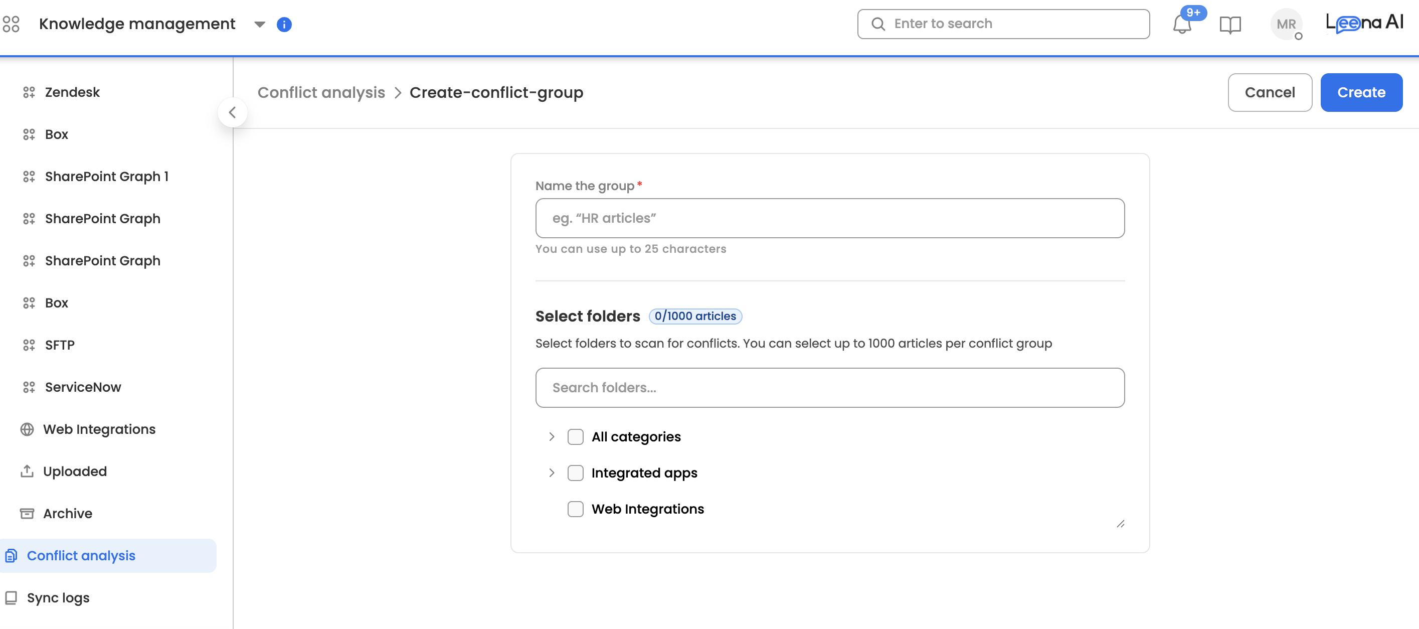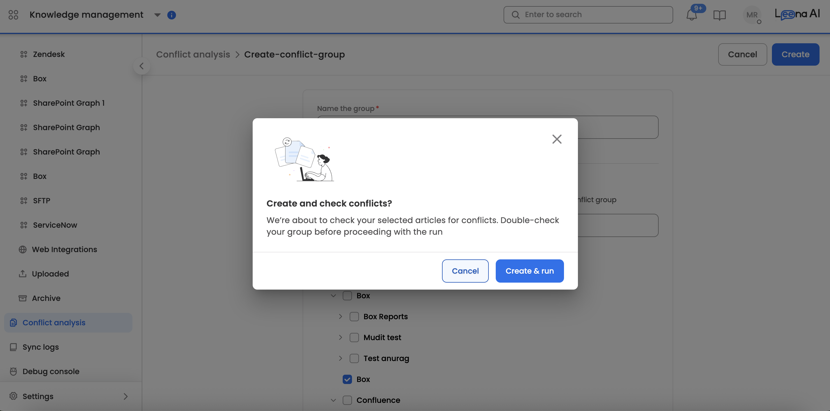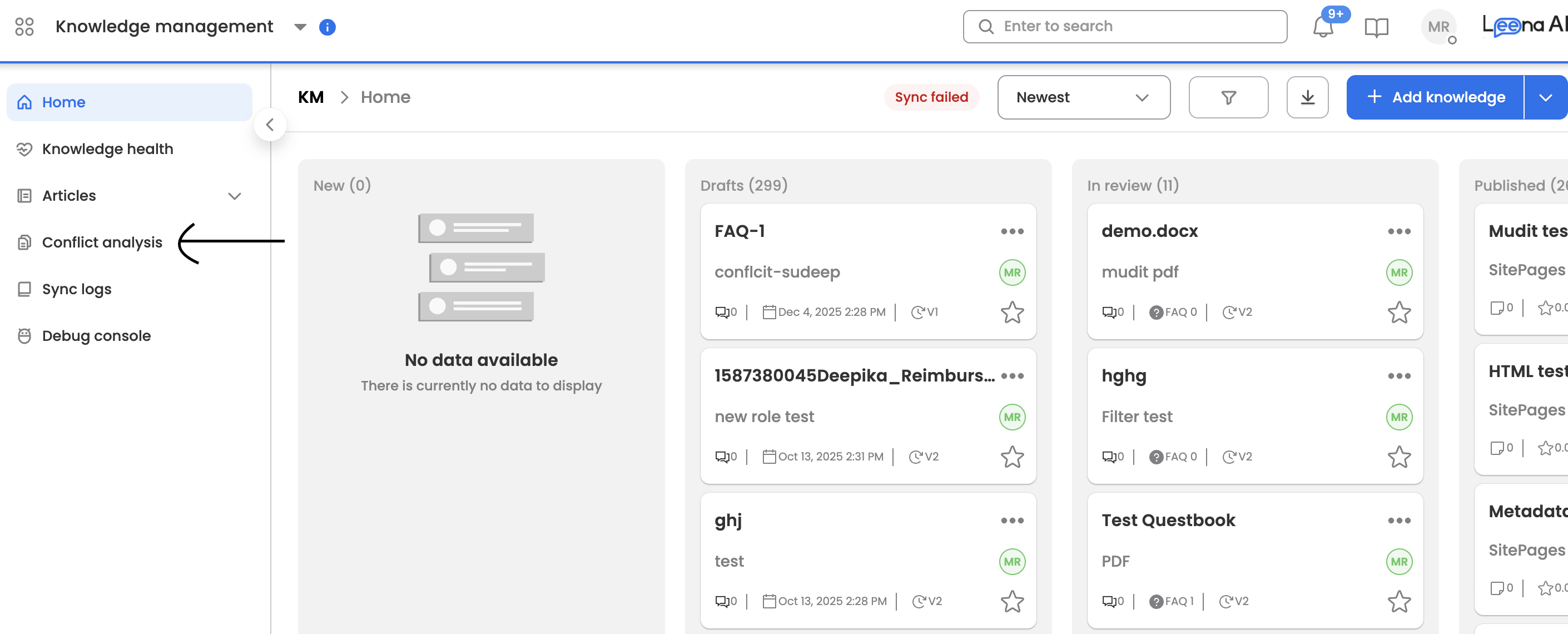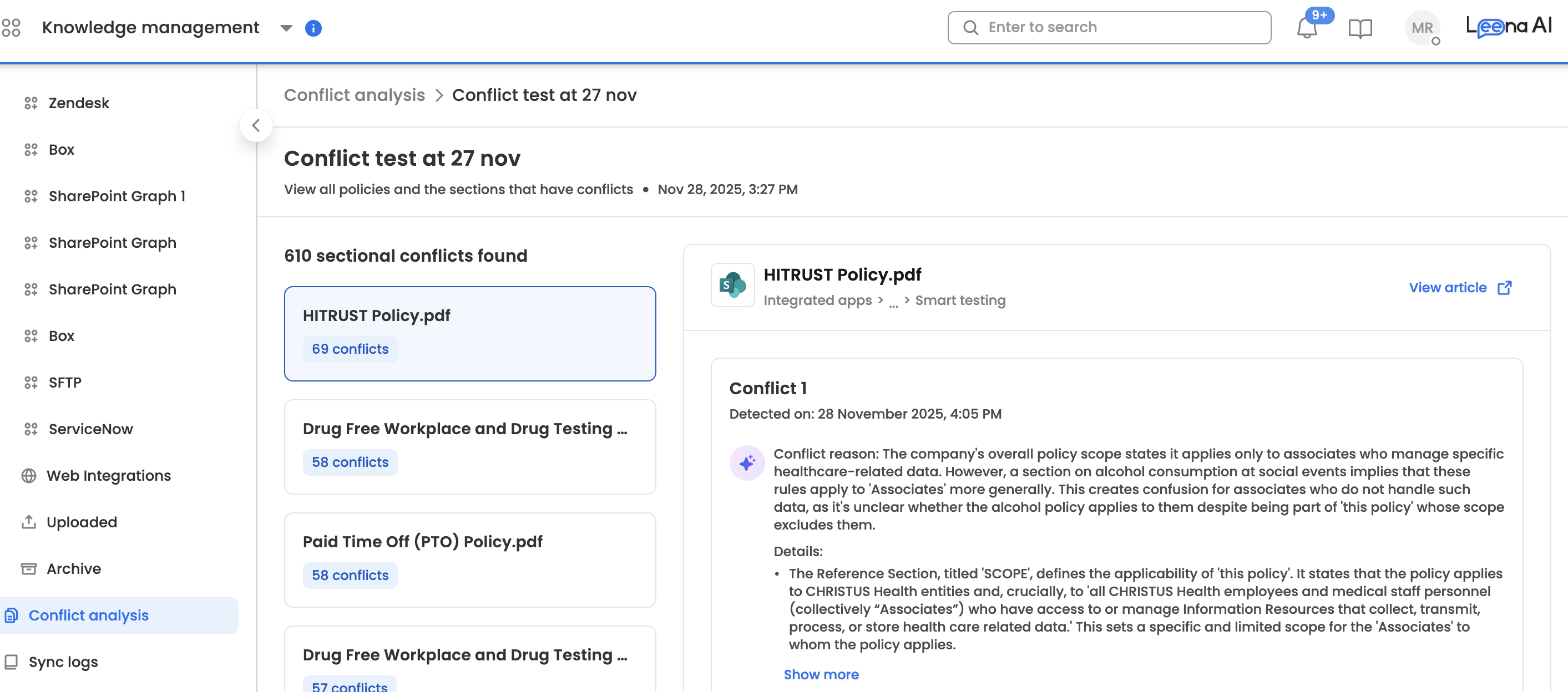 The Policy Conflict Analysis tool allows Knowledge Managers (KM Admins) to proactively "health check" their knowledge base. It automates the detection of contradictory information across your published policy documents.