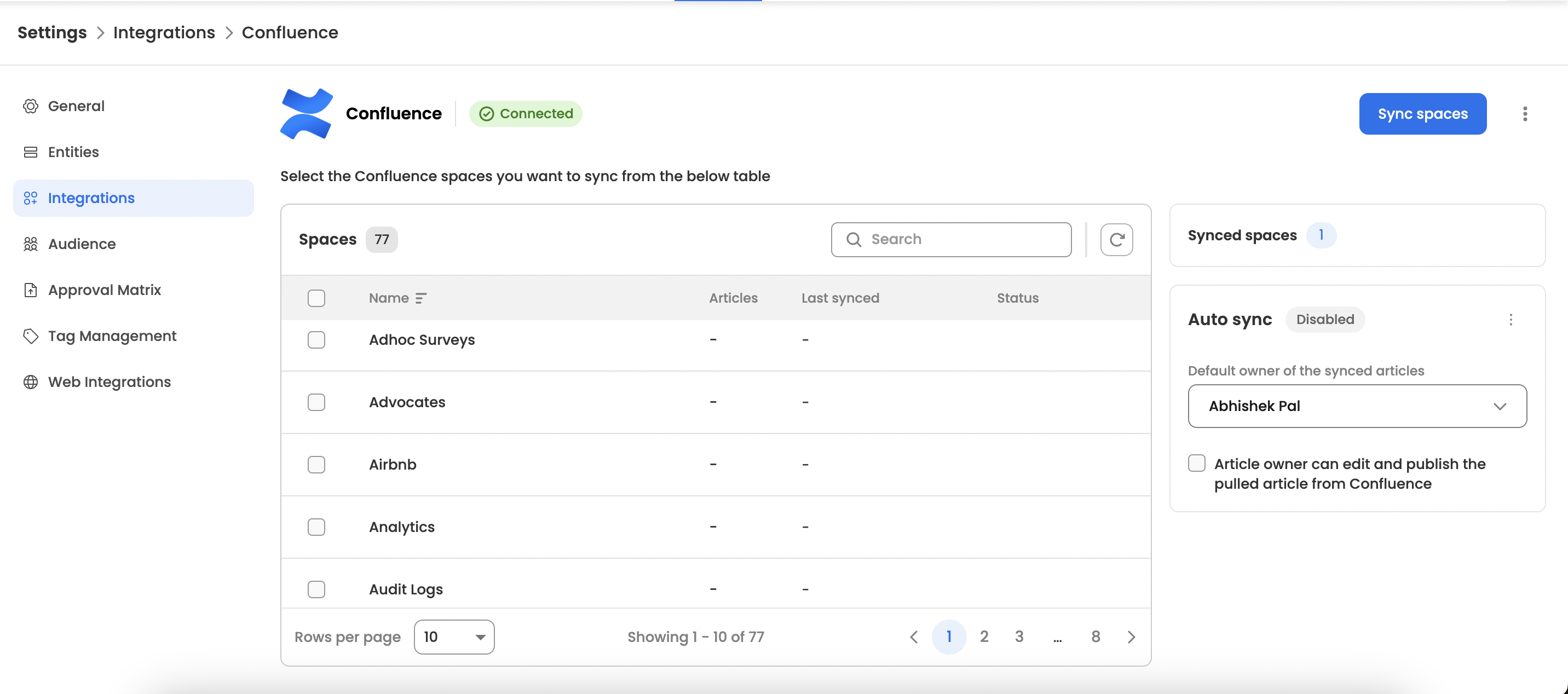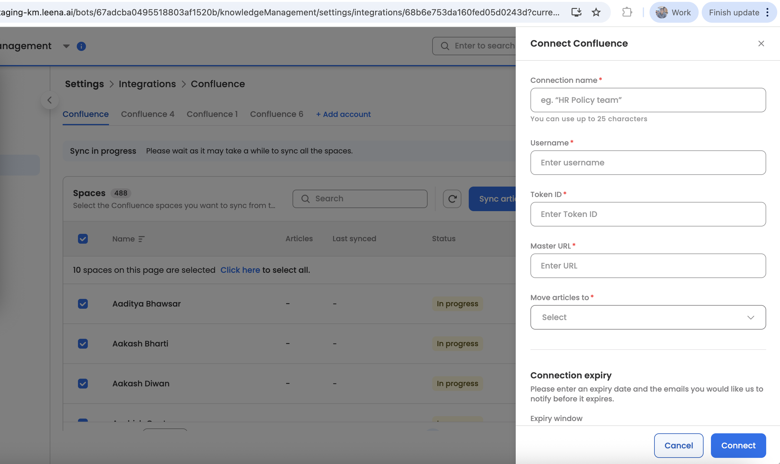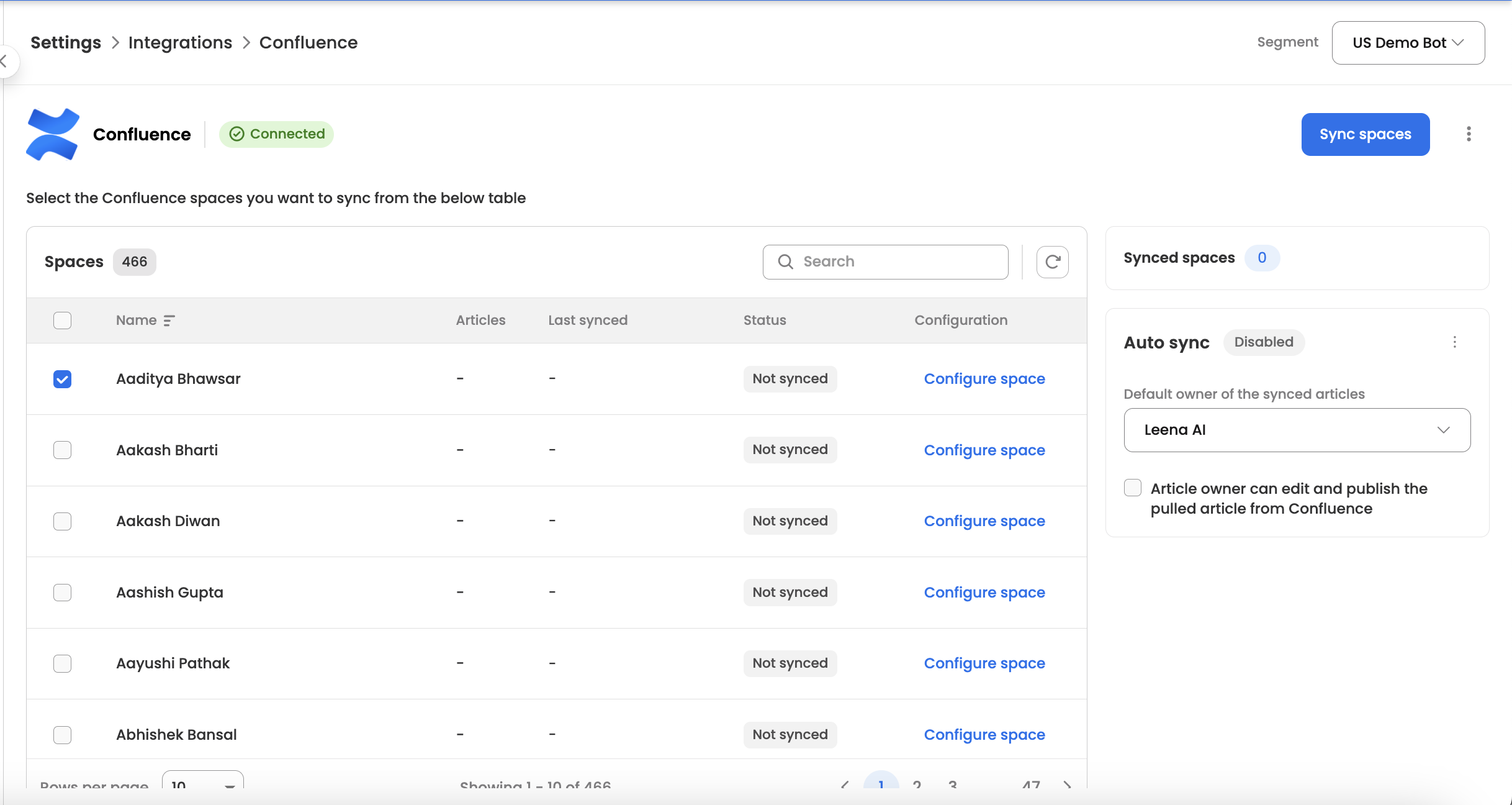 Space Selection: By default, we will sync all spaces; however, users can select specific spaces to be synced with Leena KM.