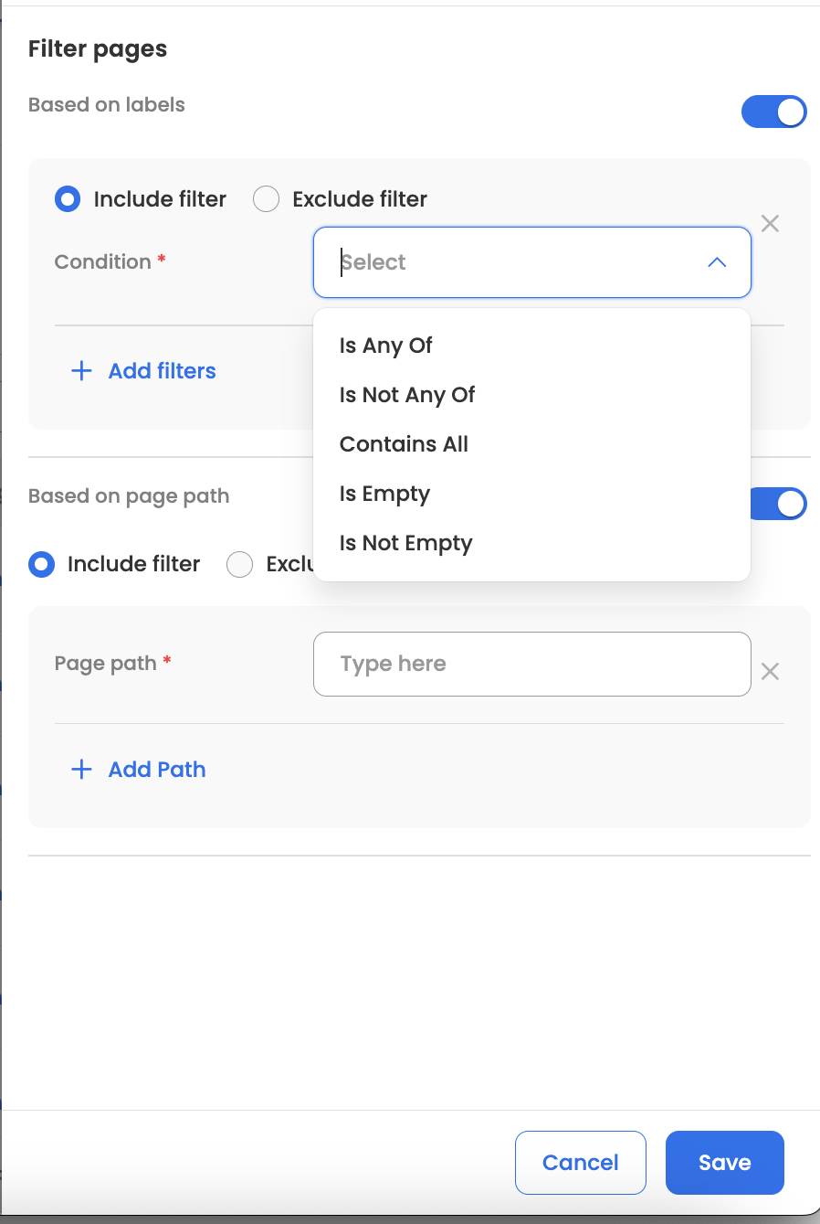 Filter Pages: Users can filter the Confluence pages they want to sync with Leena KM. You can filter based on page labels or page path in Confluence. This option can be accessed from "Configure space".