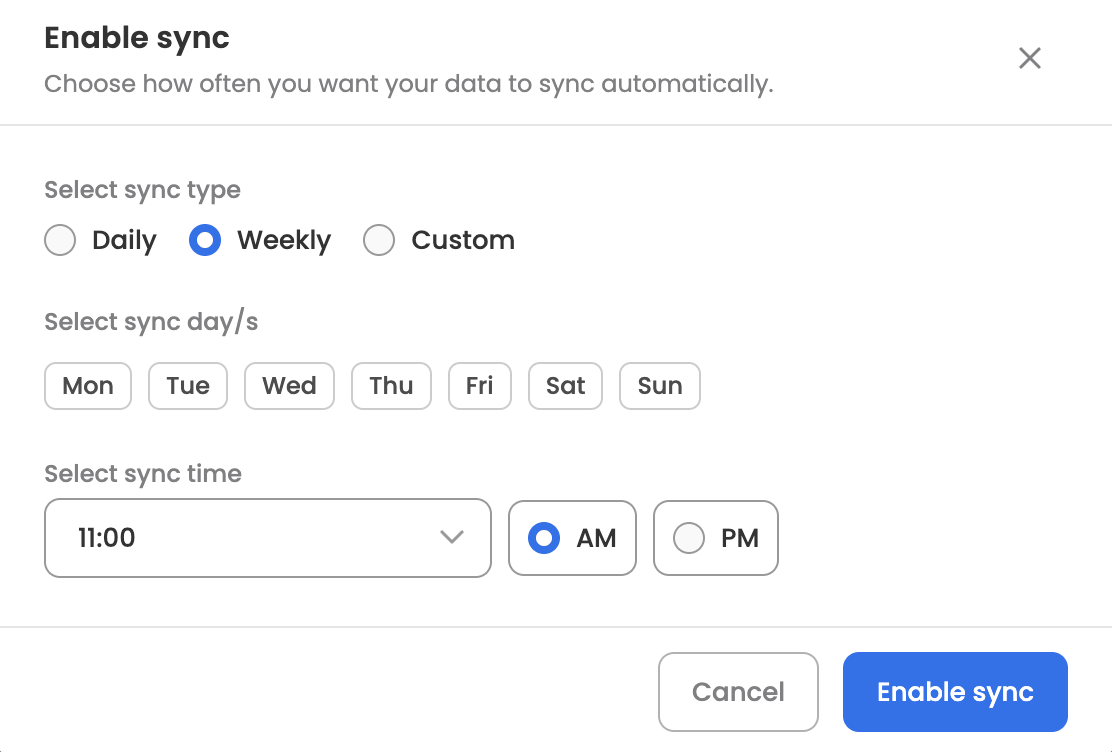 Day(s): The day(s) on which the sync needs to run weekly. Multiple days can be selected.
