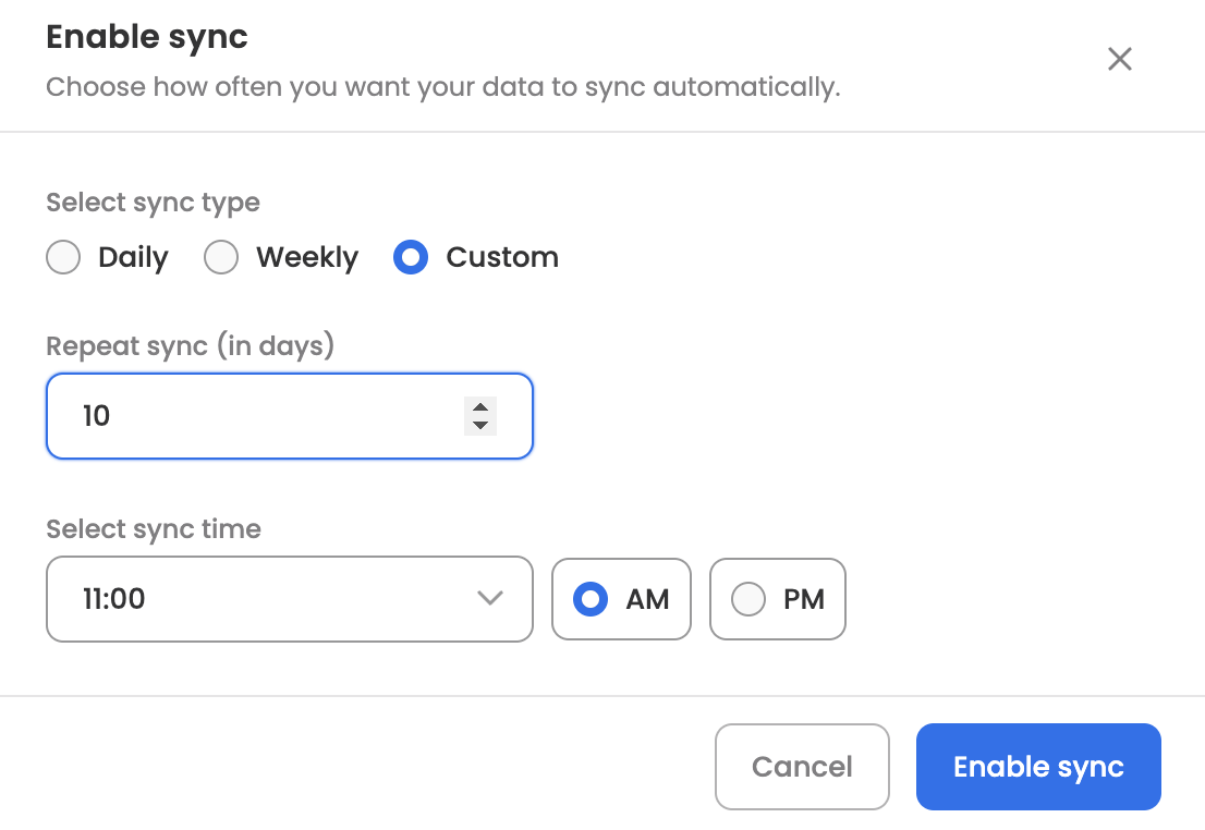The custom sync configuration allows admins to set up a custom frequency for the connector sync. Using this, admins can set up the sync for every "x" days, where "x" can vary from 1 to 30. (e.g., "x=1" means the sync will run daily, and "x=30" means the sync will run every 30 days).