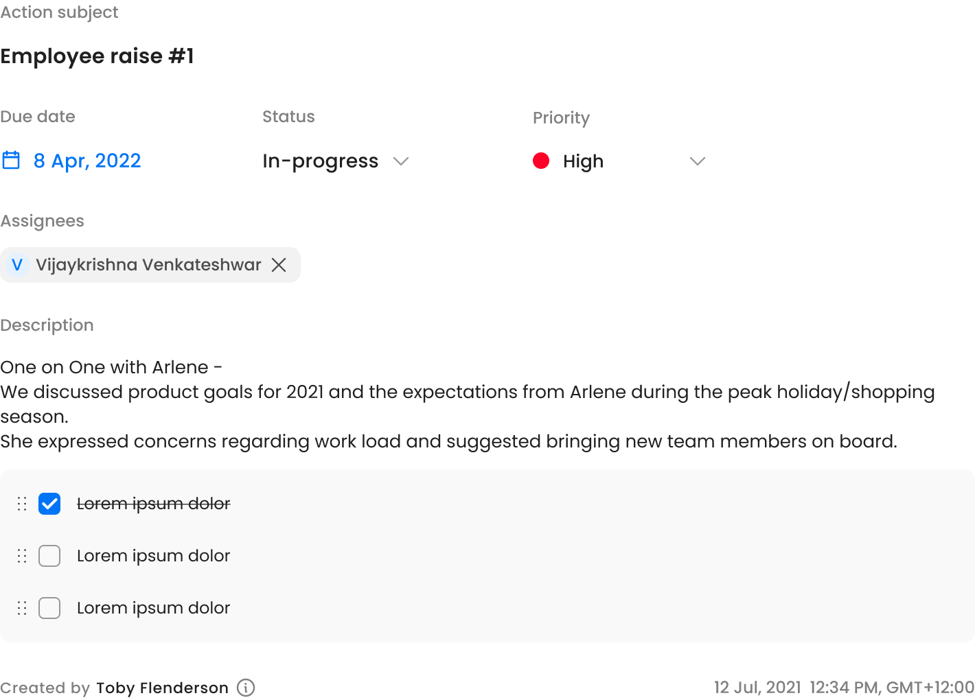 Only the creator and the assignee of an action can edit an action. Information about the action creator, the date and time of when the action was created, is also visible.