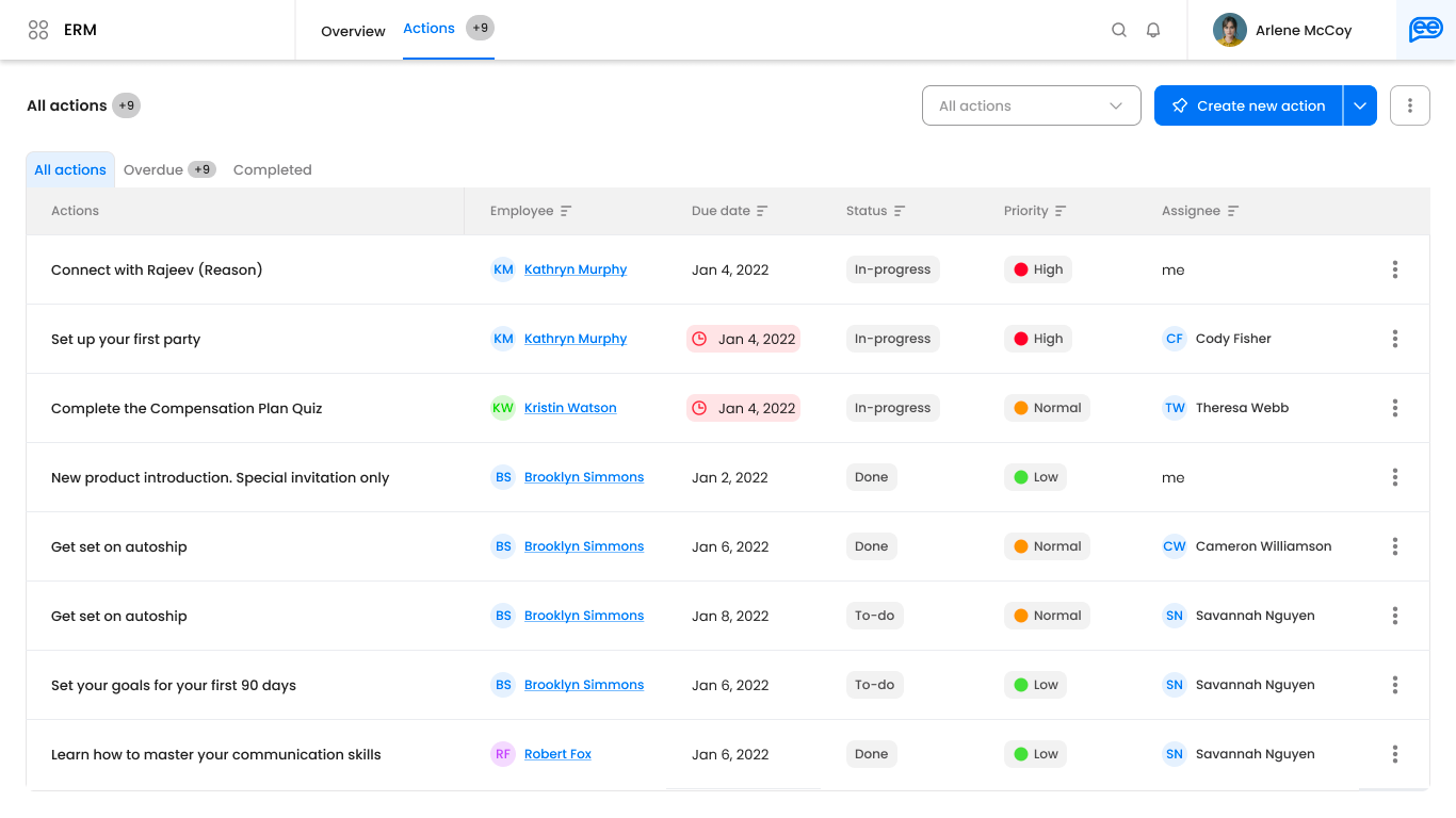 Create a new action - The user can also create a new action from this page, in addition to the individual employee page.