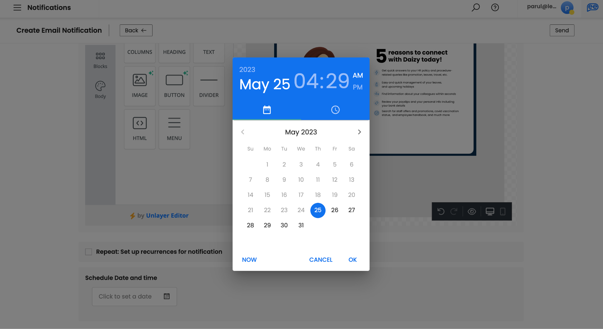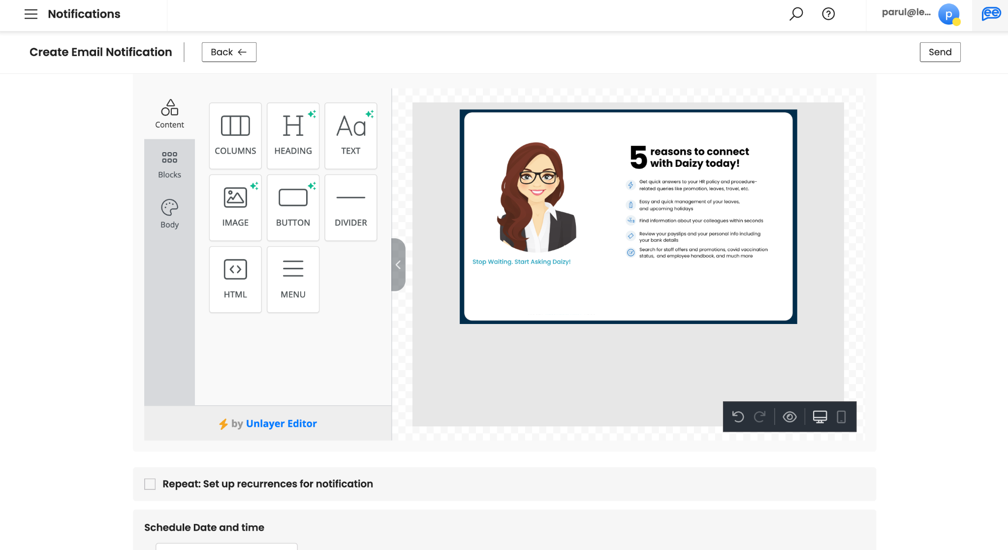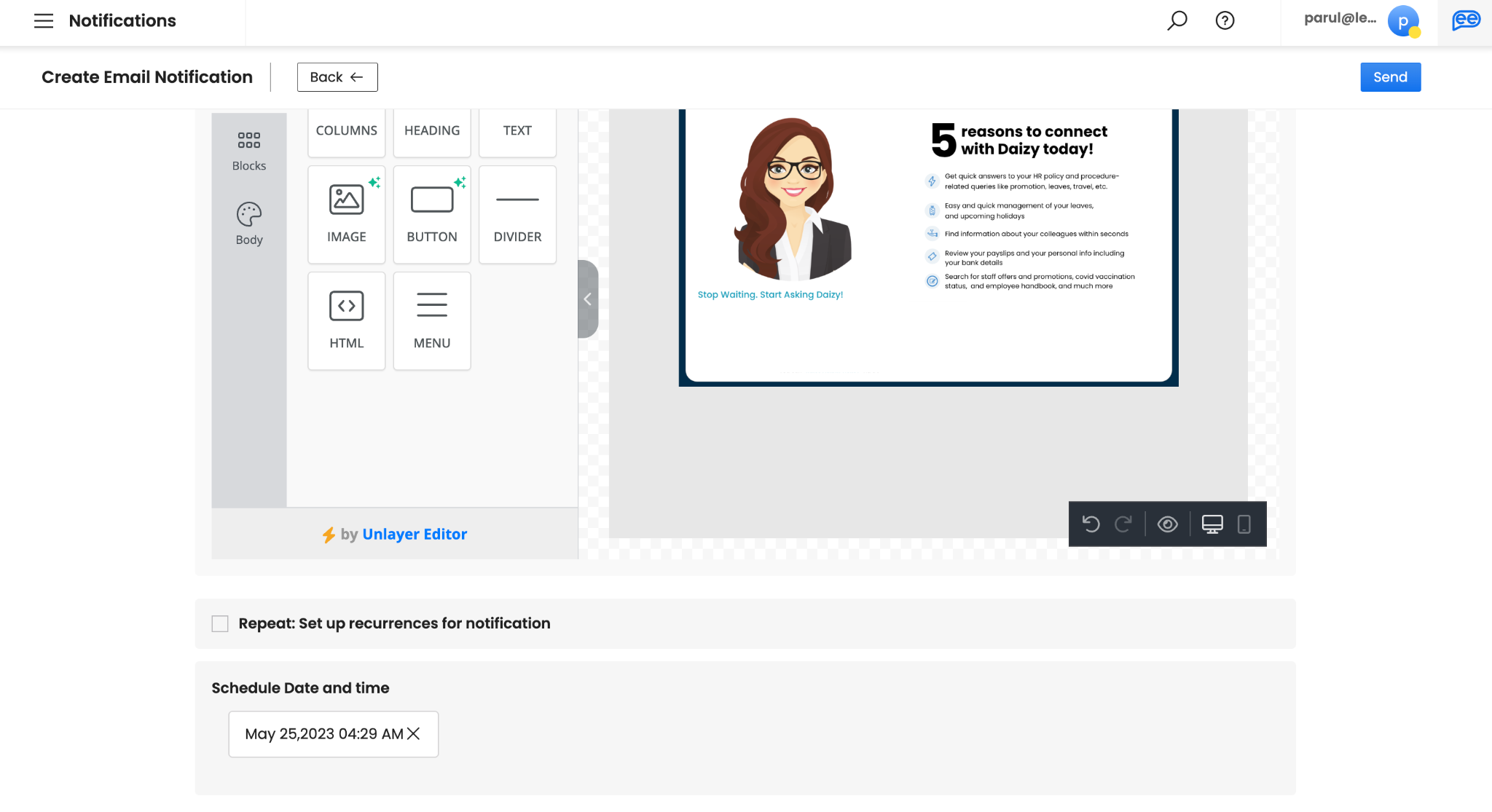 Create your Email via our editor. You can a variety of drag-n-drop elements to design a rich HTML email. There is no limit on text. However, shorter emails with less than 2 minutes reading time are recommended.