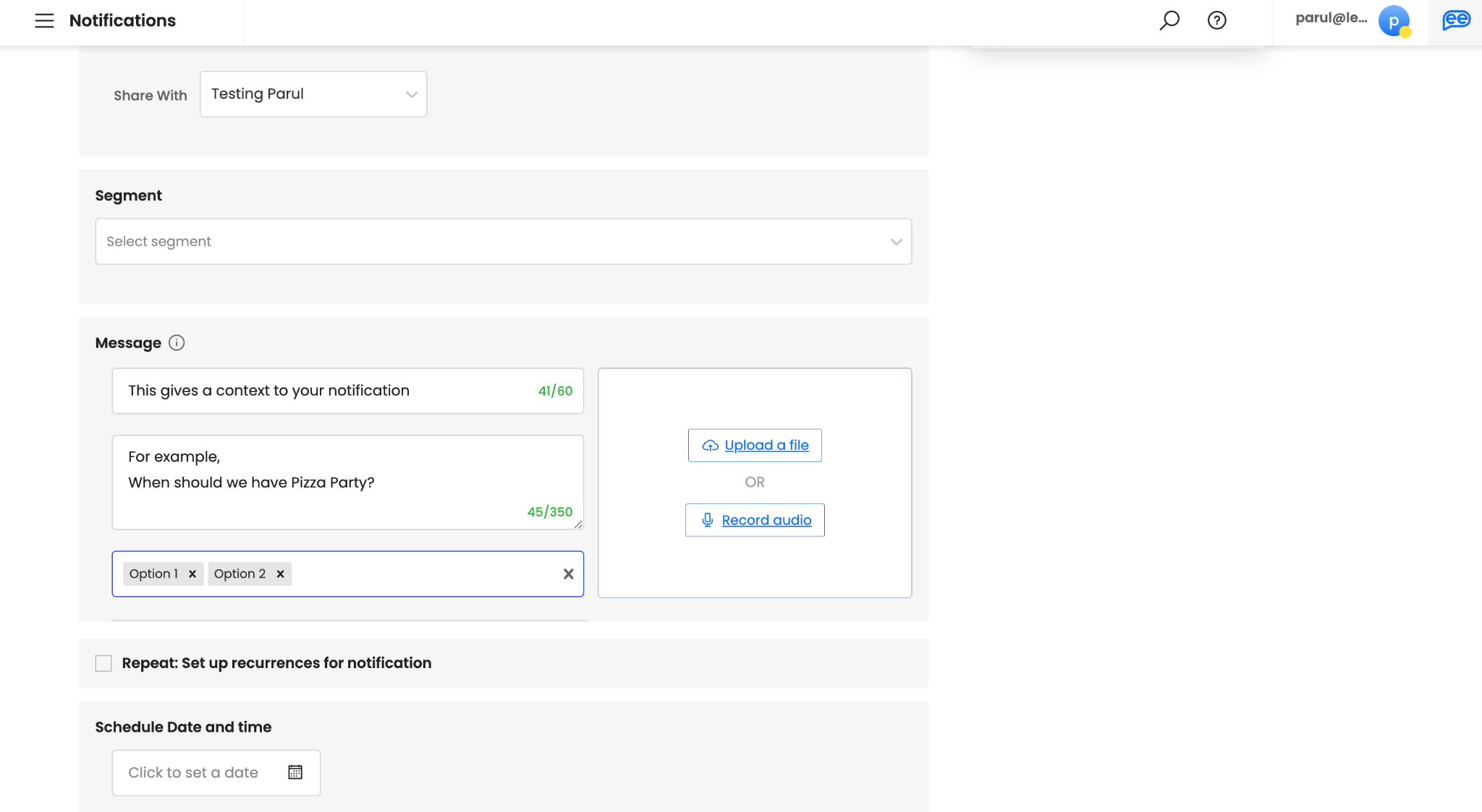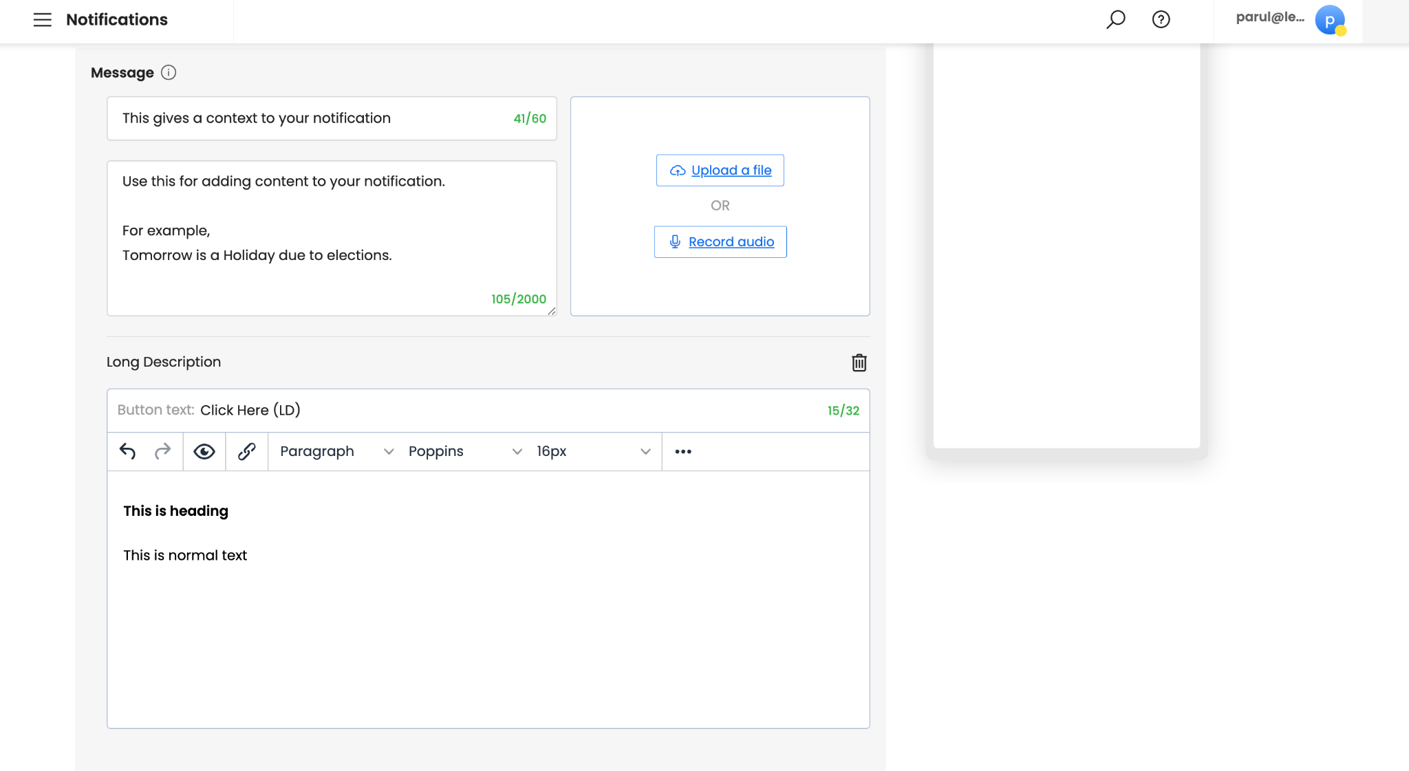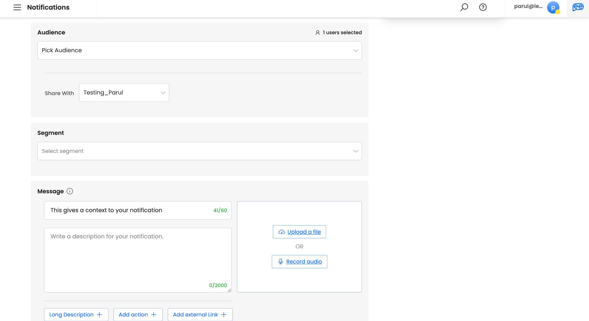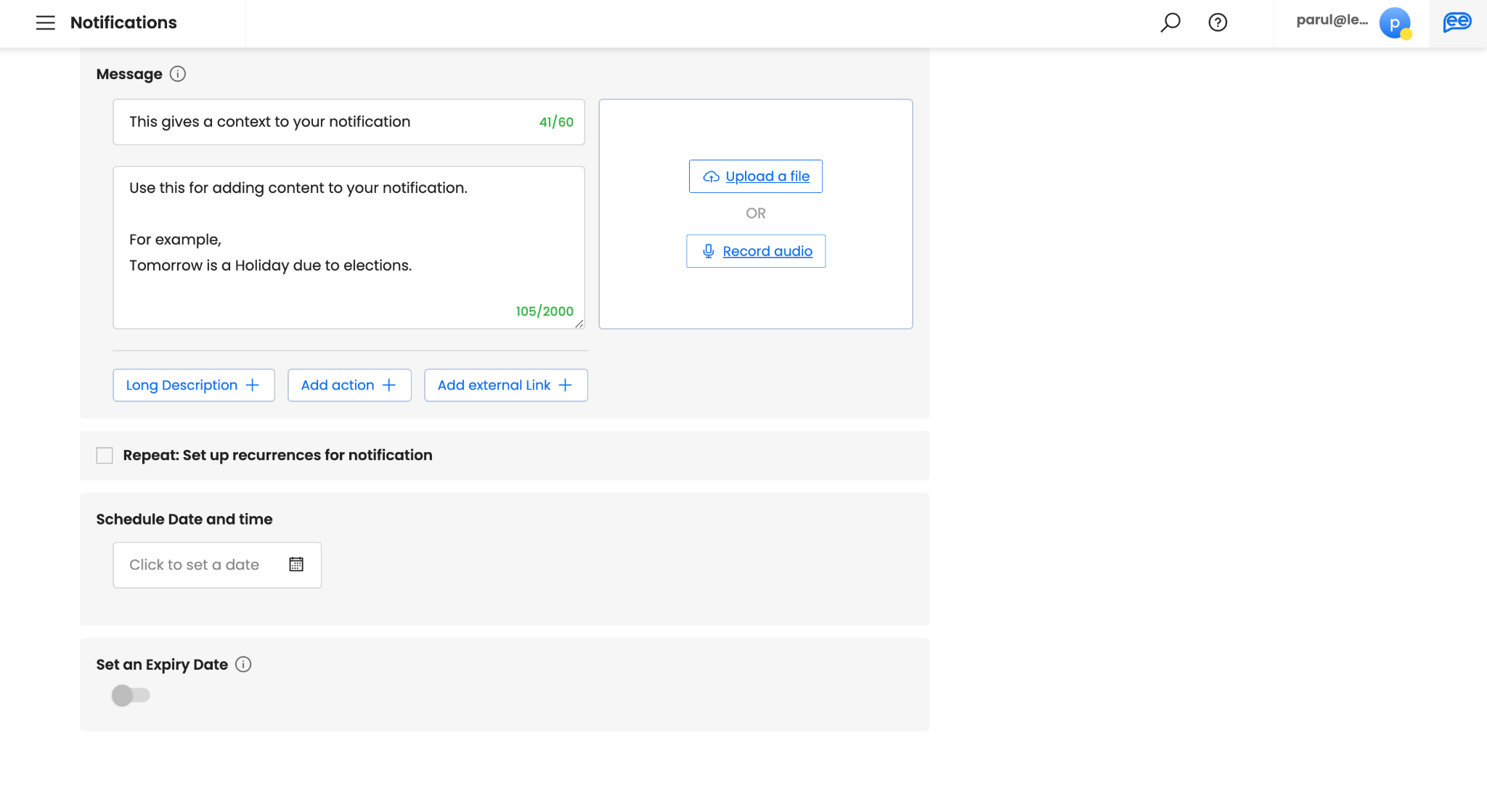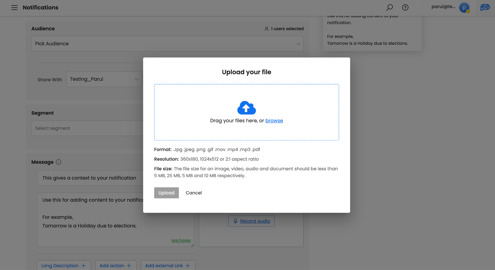 Add supporting Attachments, if any. Attachments are optional. It makes your notifications more engaging. You can either record a live “Audio” or upload any existing file. For uploading a file, images (.jpg, .jpeg, .png), gifs (.gif), videos (.mp4), audio (.mp3), and documents (.pdf) are supported.