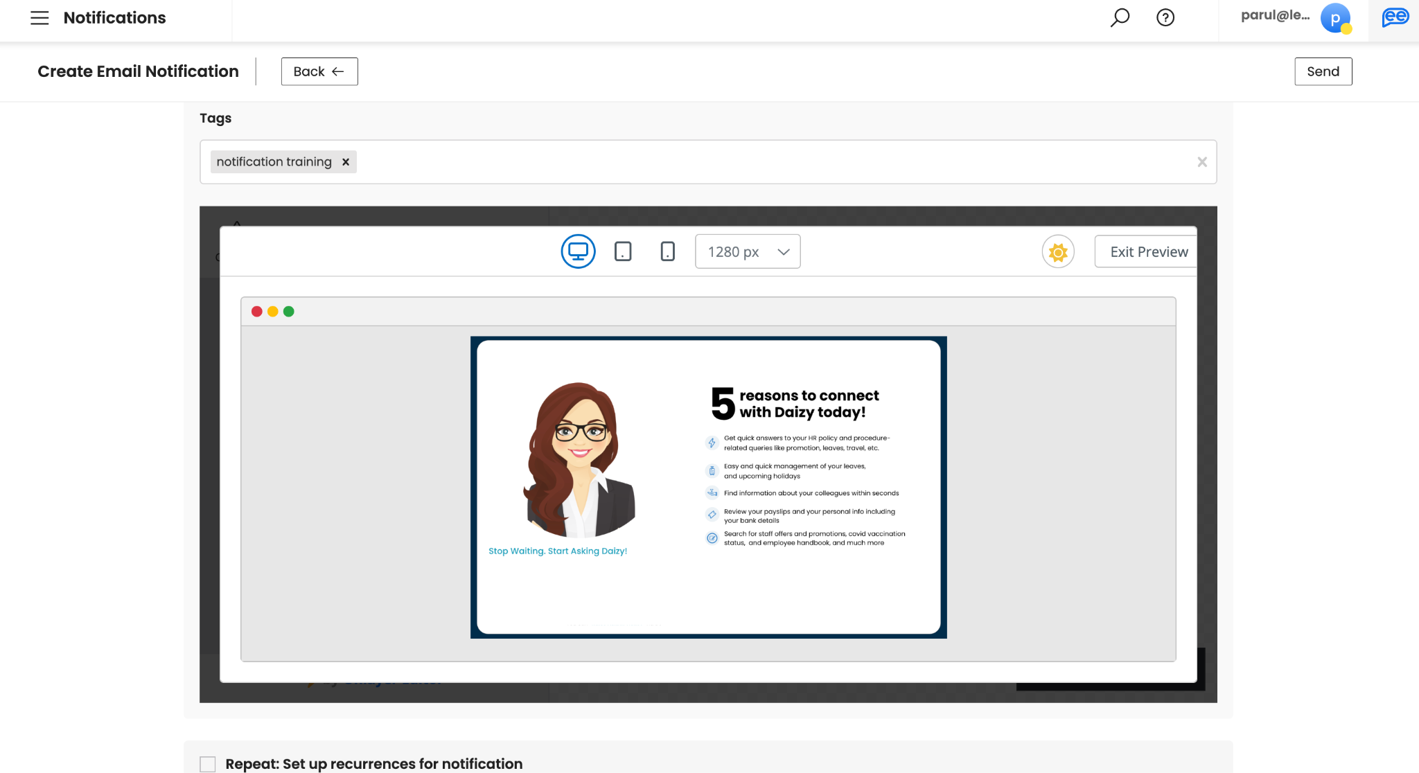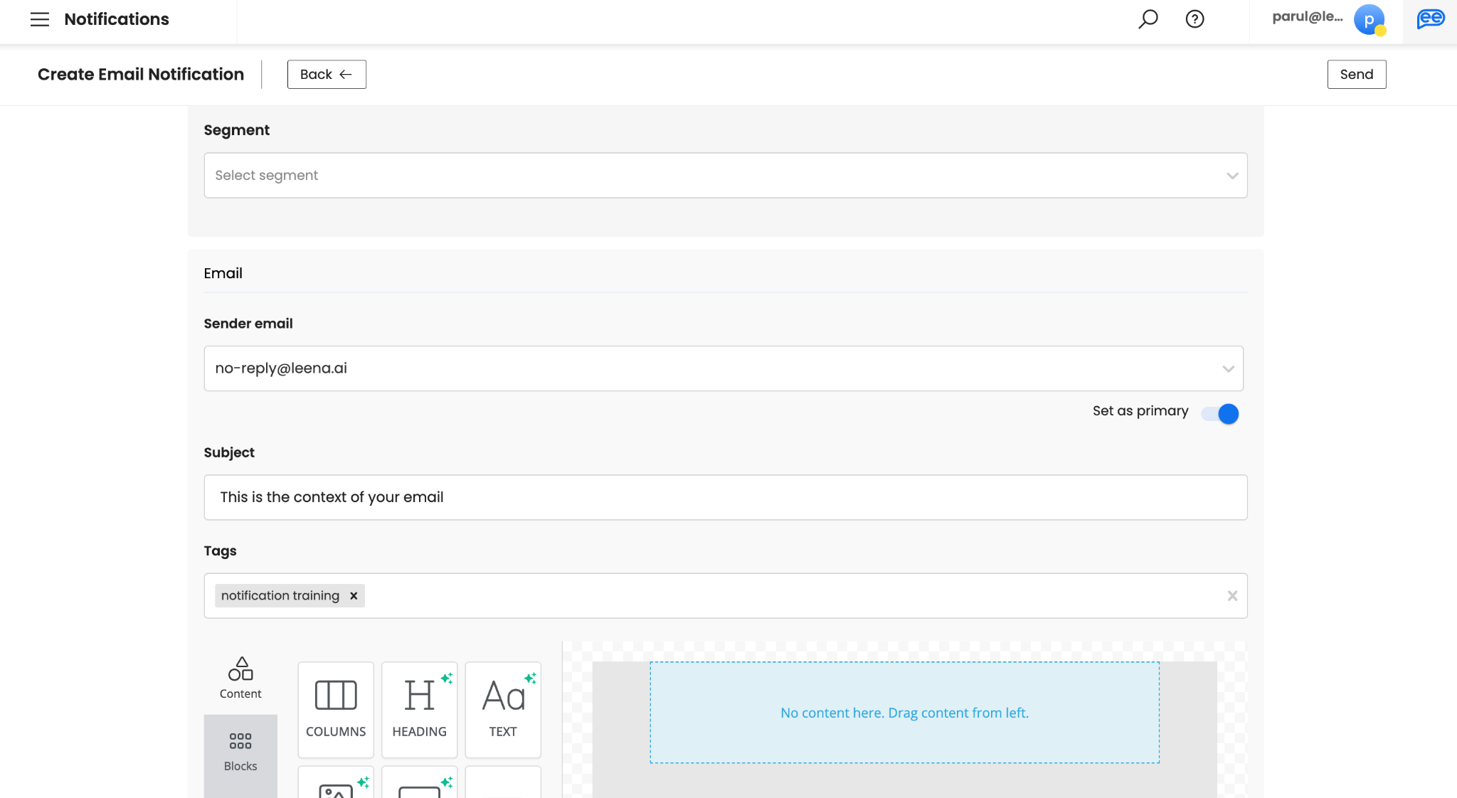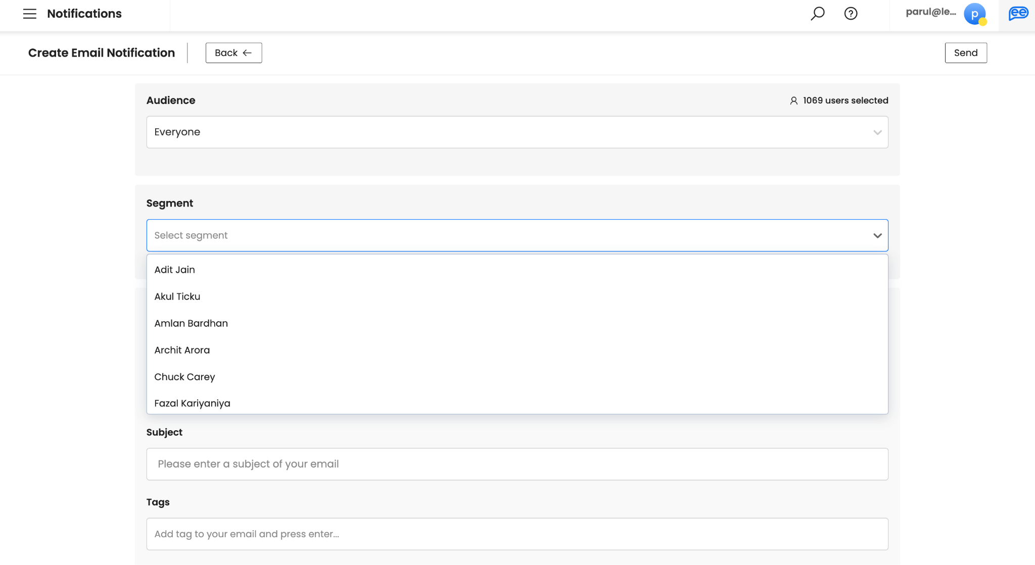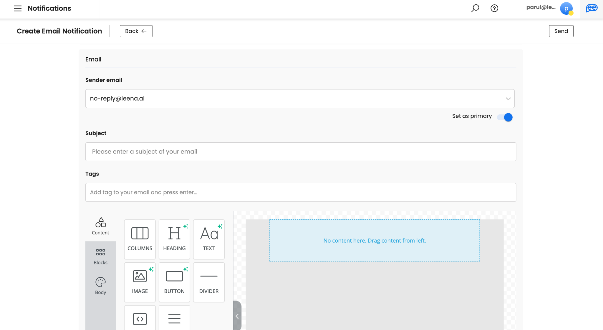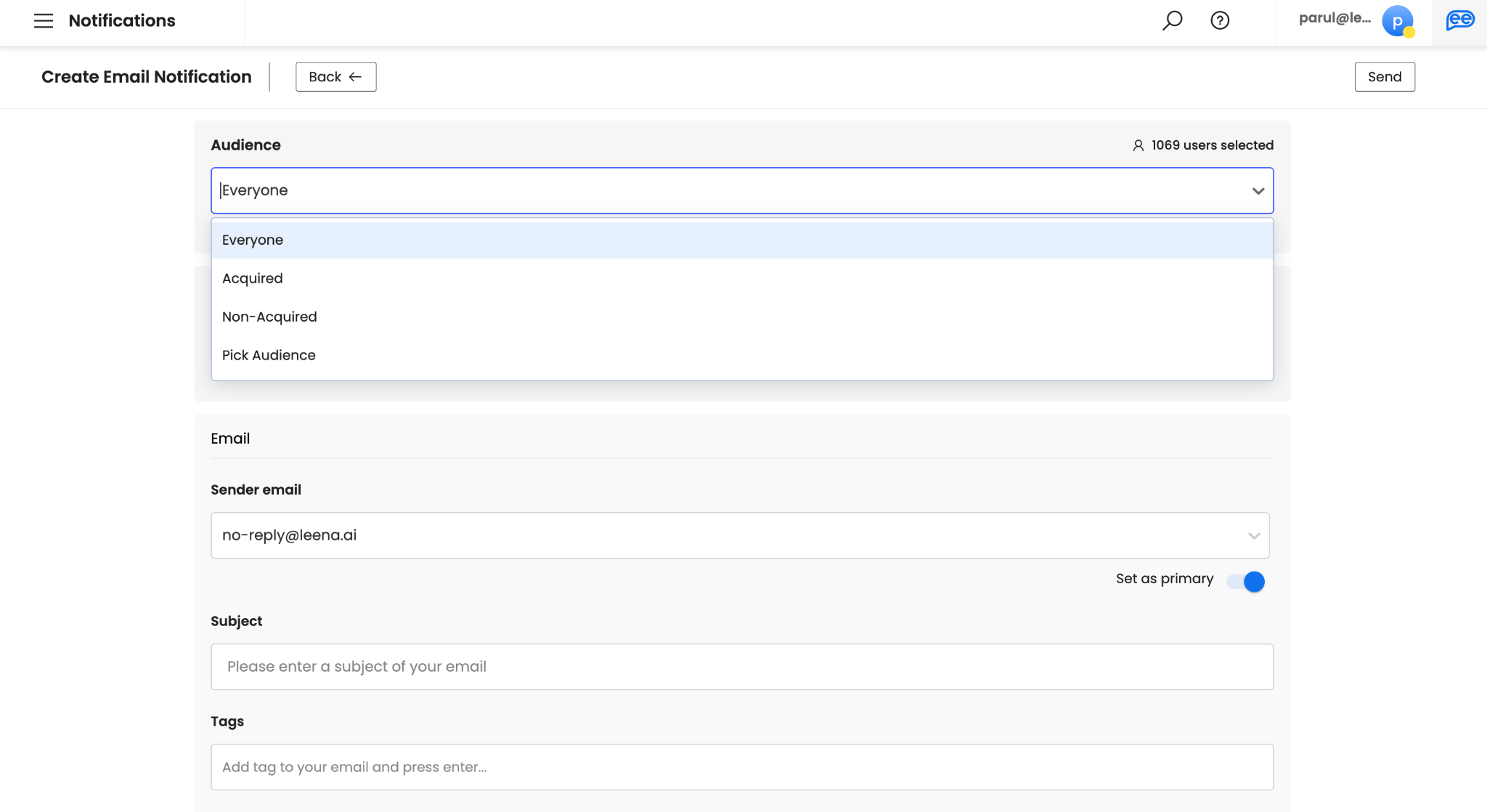 Add the Tags for your email. Adding at least 1 Tag is mandatory and should identify the intent of the email. Please note, tags are not visible to your audience.