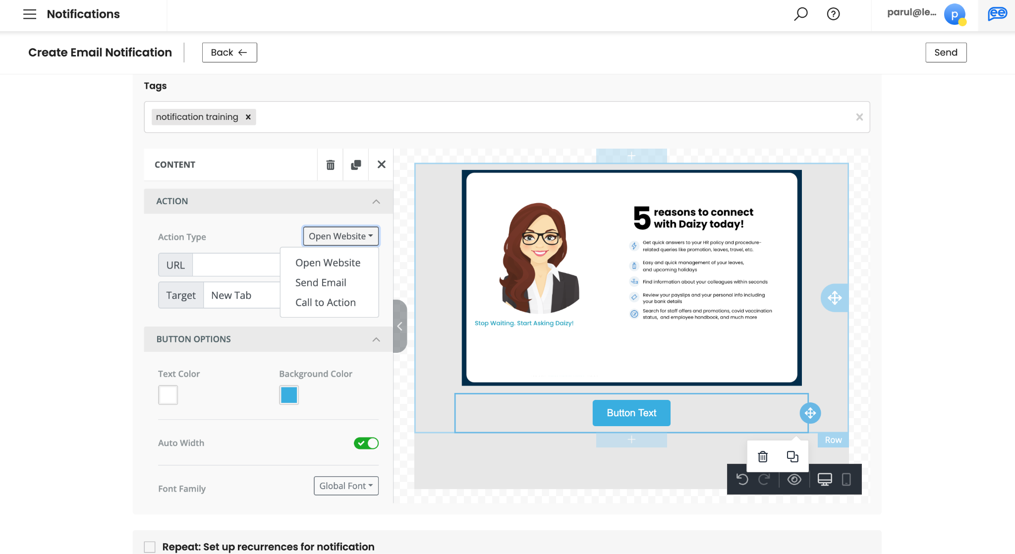 Define Call to Actions, by adding buttons or hyperlinks. There are 3 types of actions - Open Website (to add external links), Call to Action (for adding Leena AI virtual assistant actions), and Send Emails (to create a draft email).