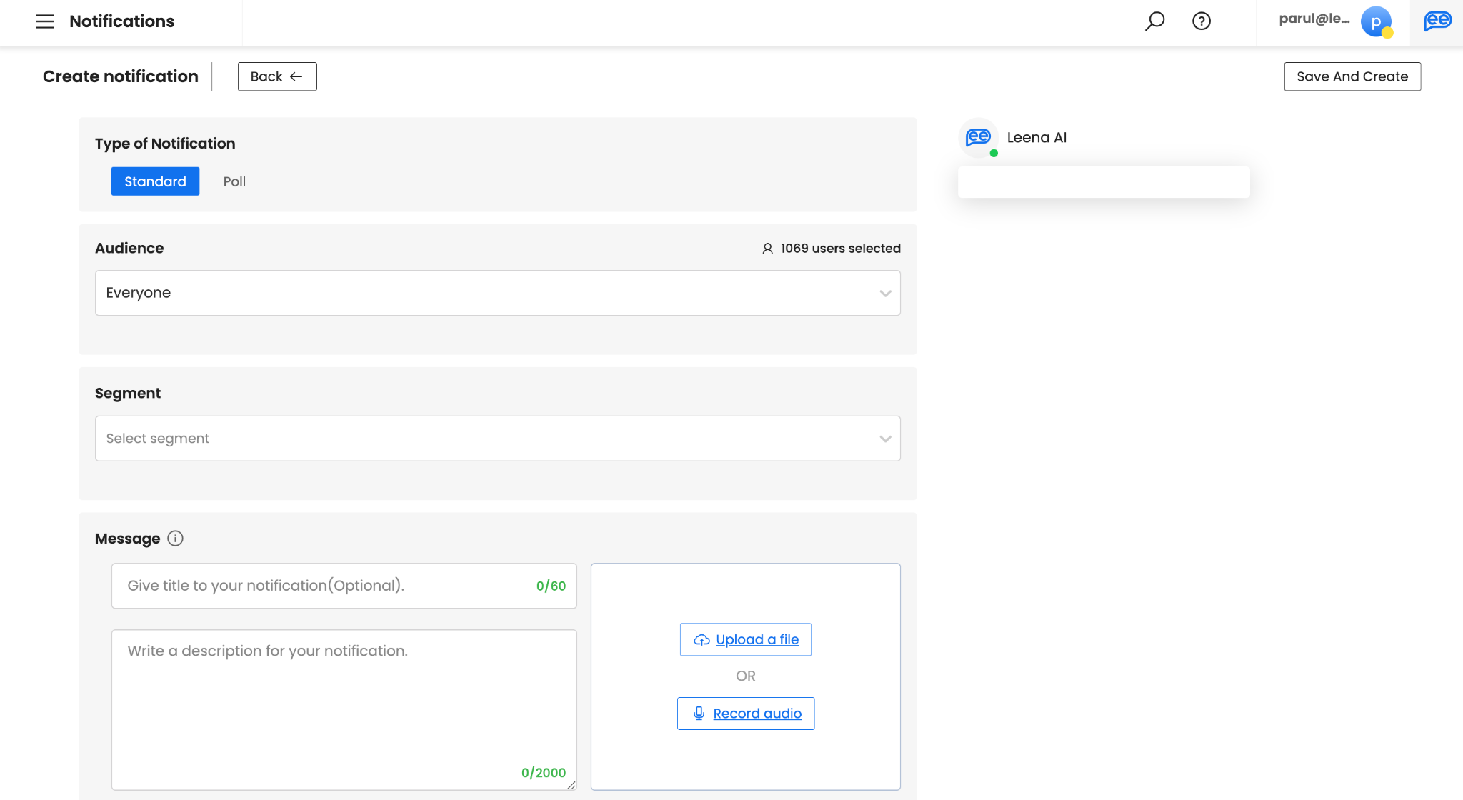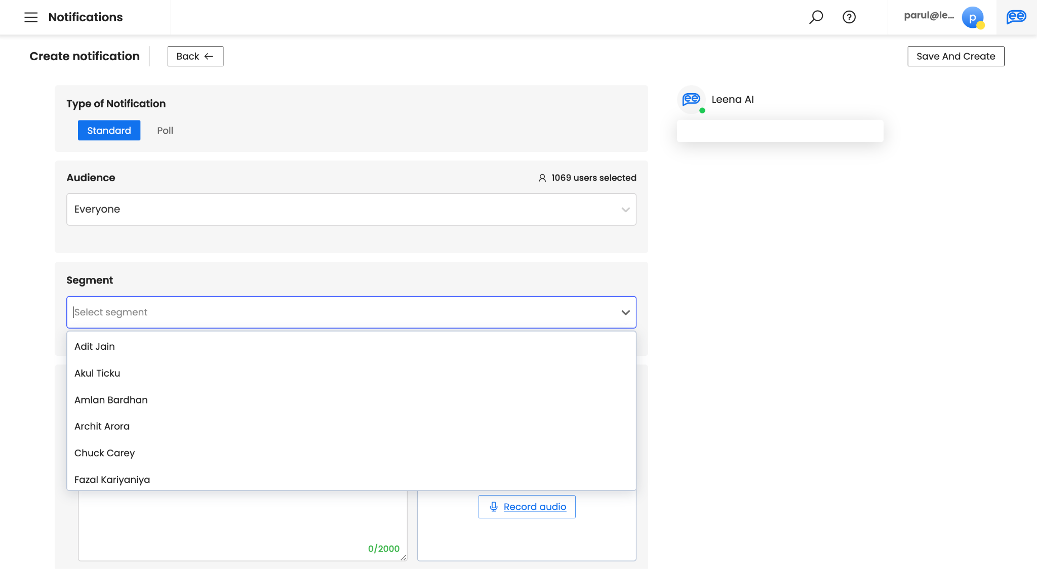 Choose your Segment. A segment is bifurcation of Leena AI’s knowledge for different sections of your employees. It can be defined on various parameters while setting up for Leena AI virtual assistants. It is disabled unless segments are enabled. For more information, connect with your Leena AI project team. If you select a Segment only the employees in that particular segment will be picked. If left unselected all the employees (users) based on Audience selection will continue.