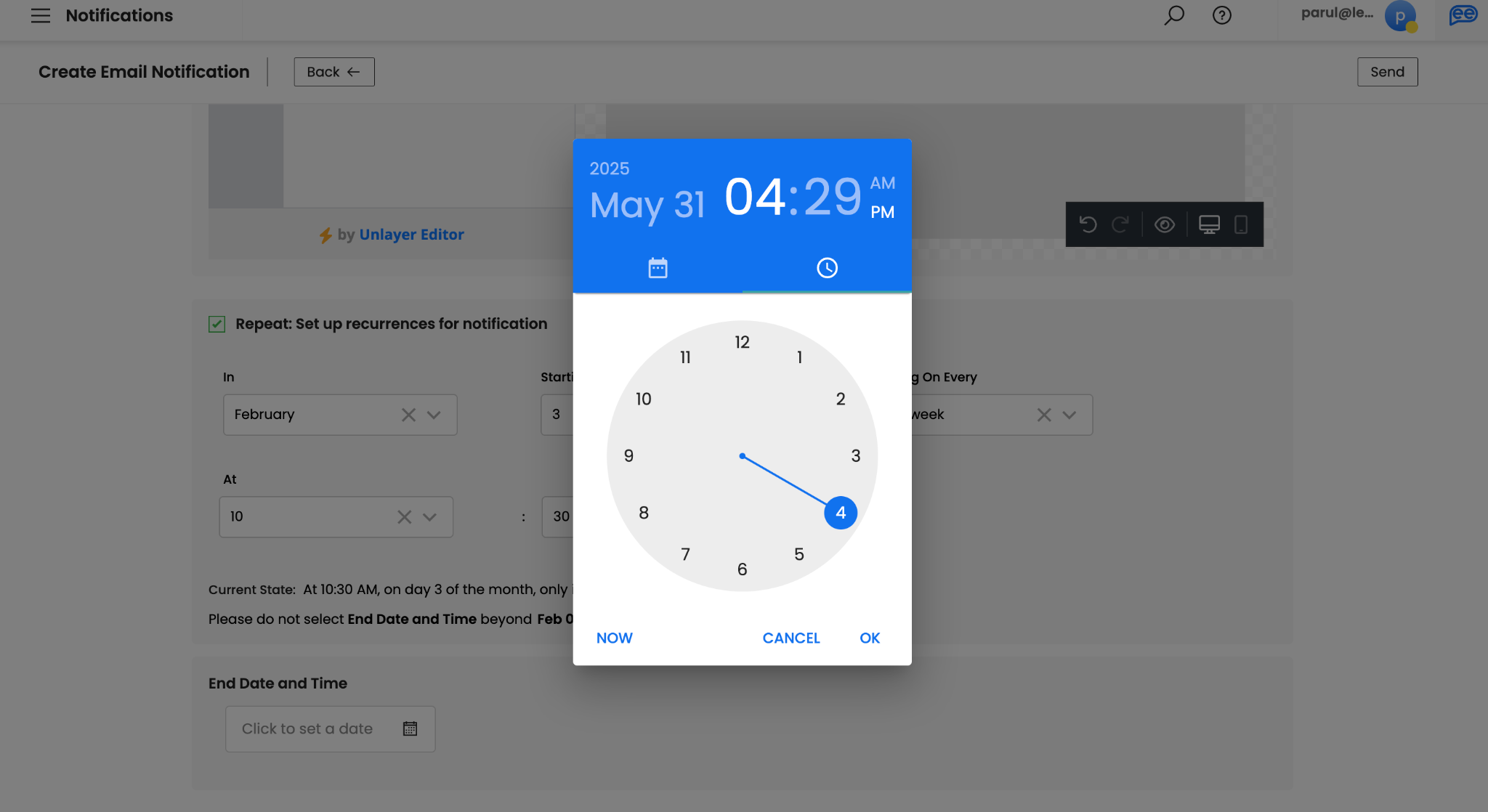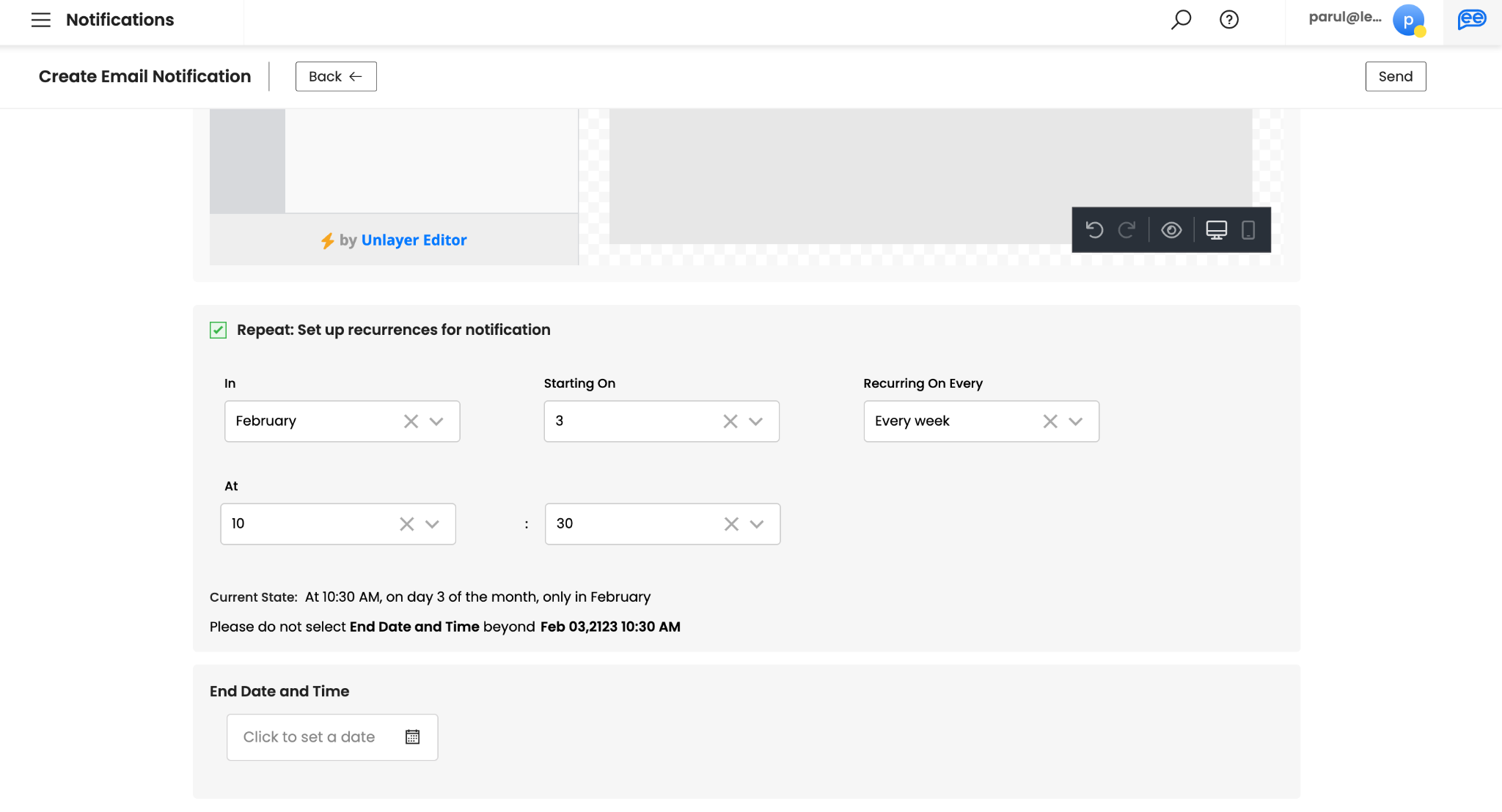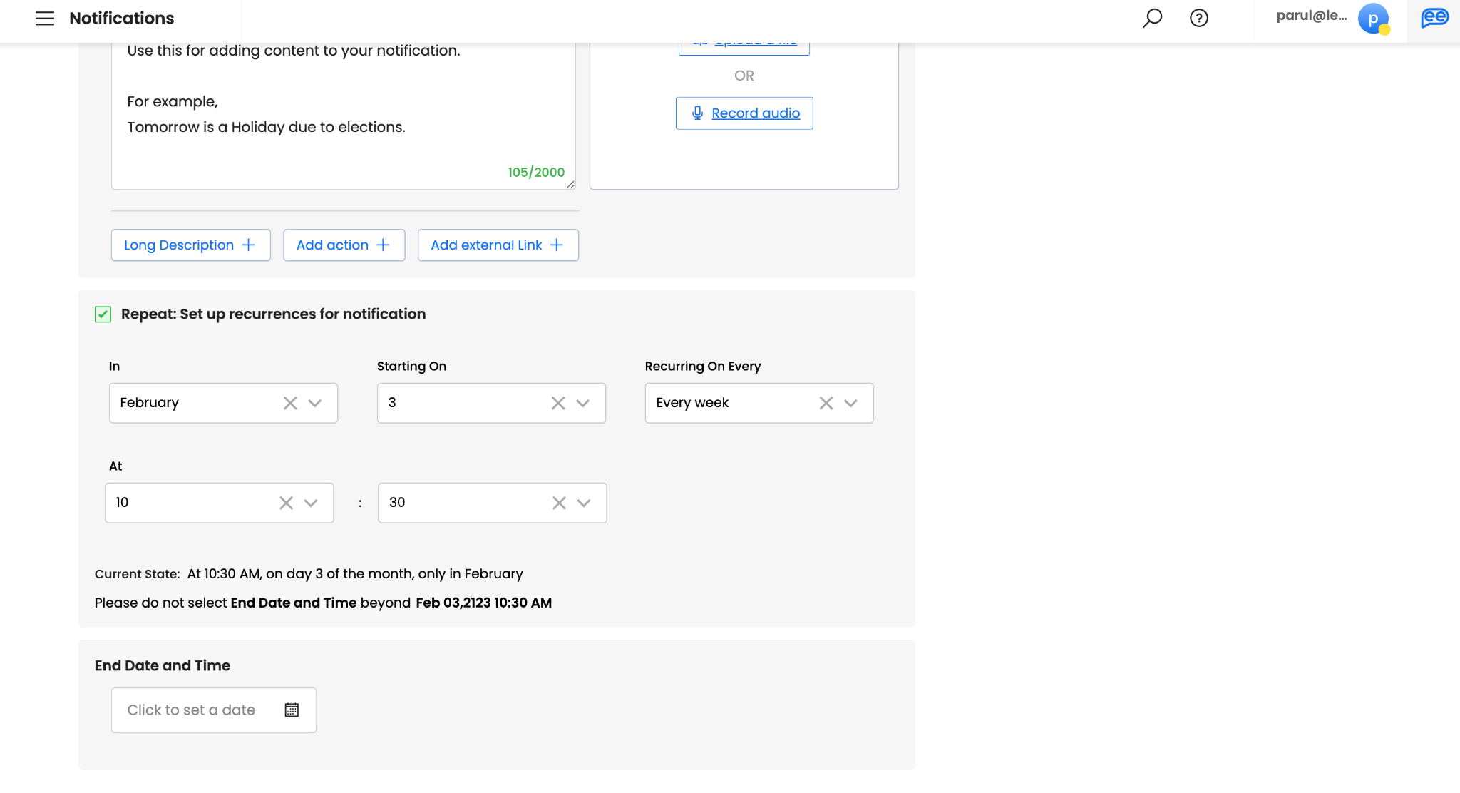 Select Repeat, if you want create a recurring notification. If not, you can skip this step. You can define your recurrence pattern by selecting a particular month, date, day of the week, and time. A recurrence pattern will automatically identify the schedule for the notifications based on your inputs and give a suggested End Date and Time for the 100th instance.