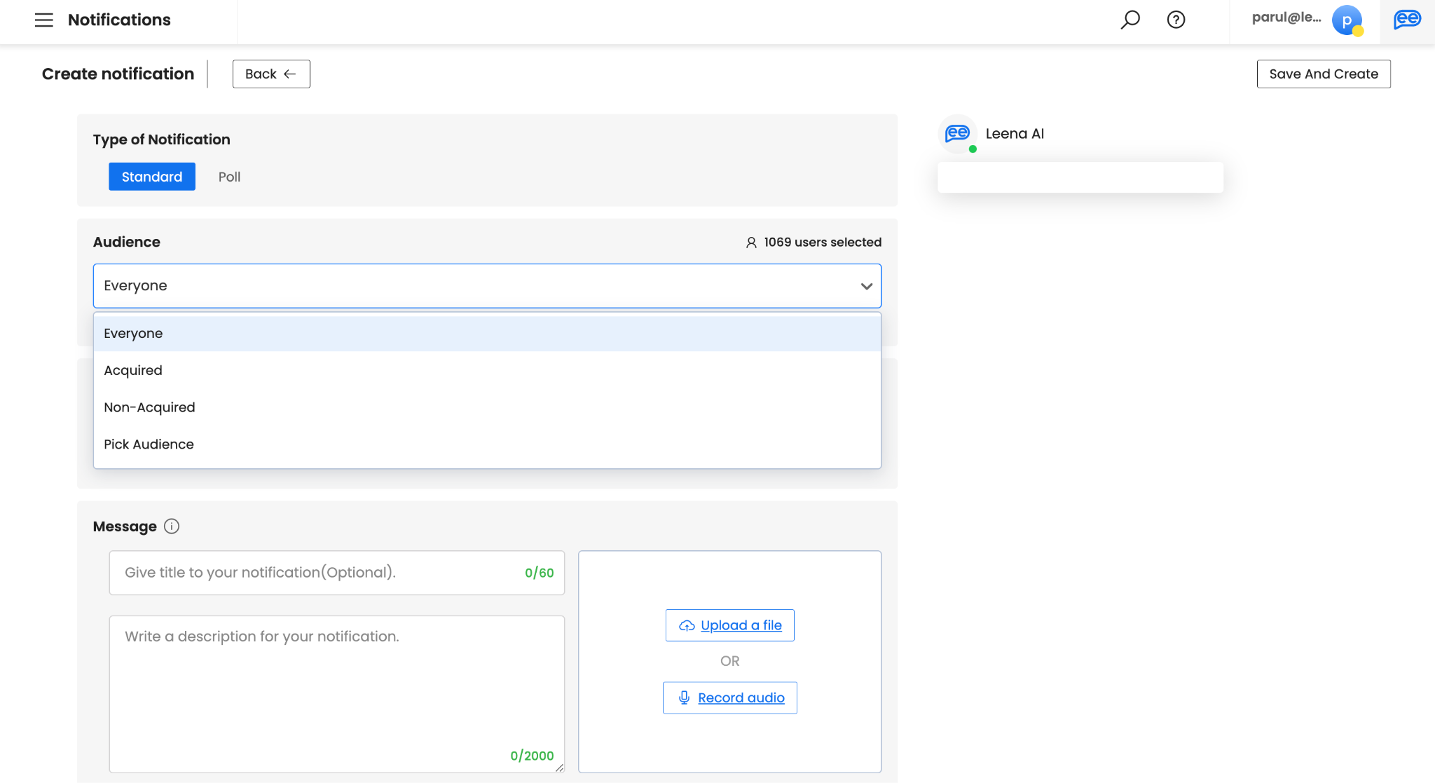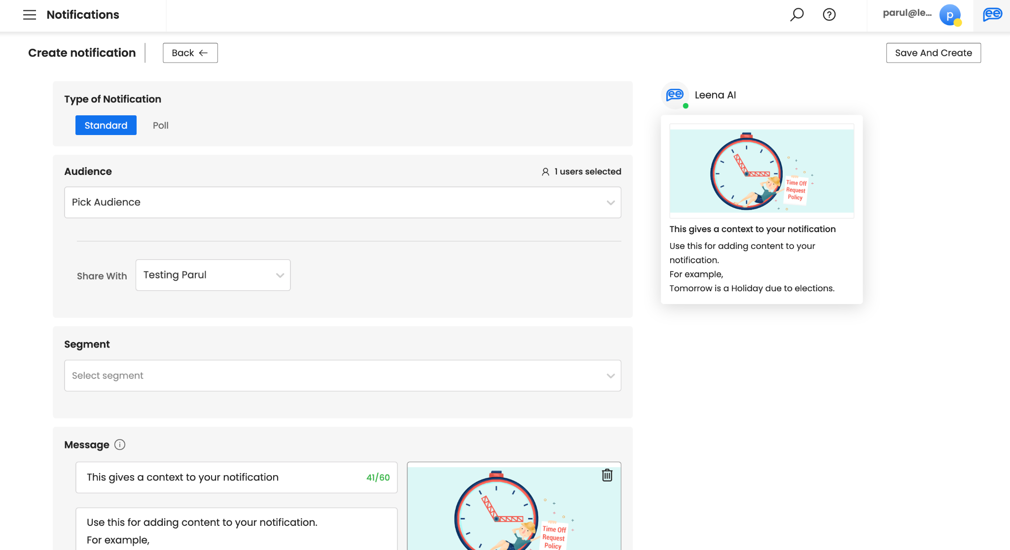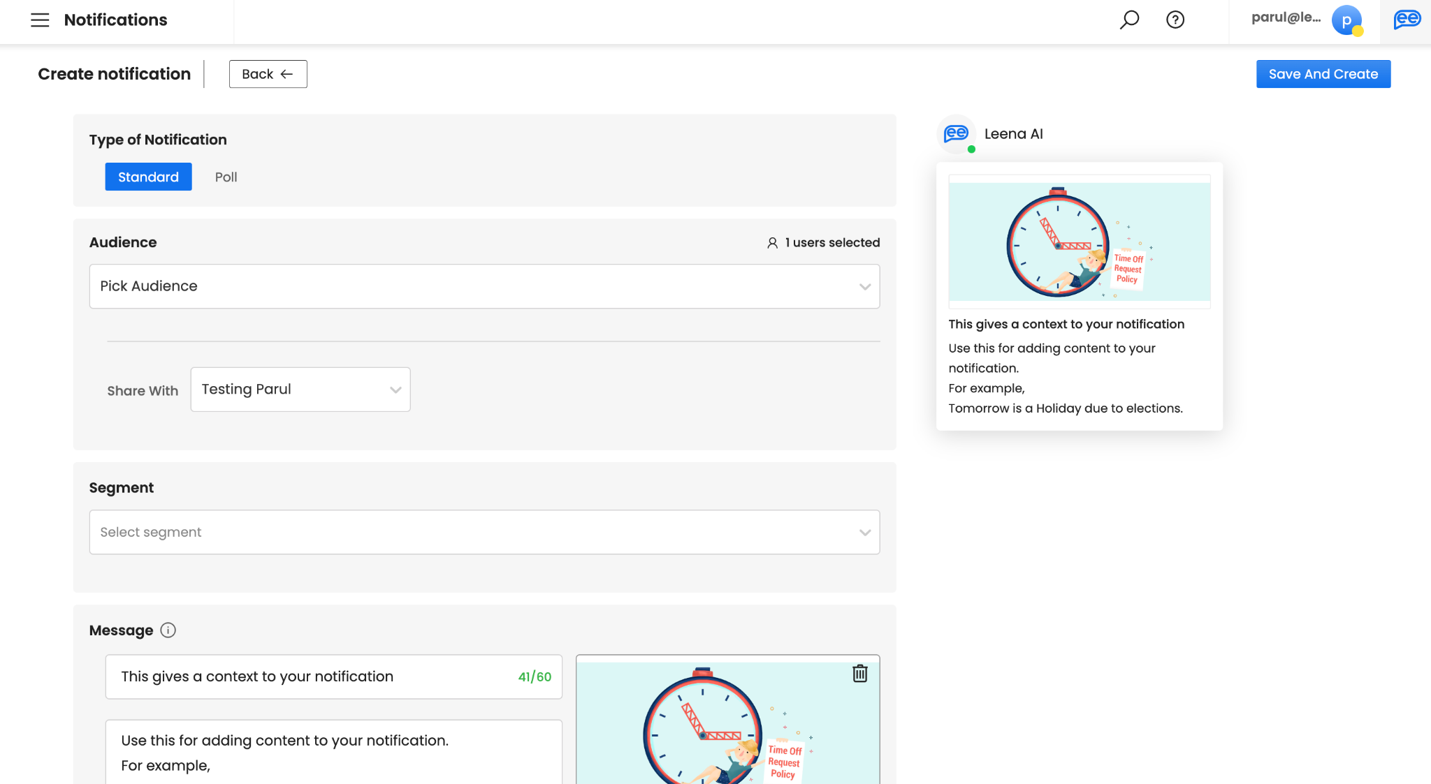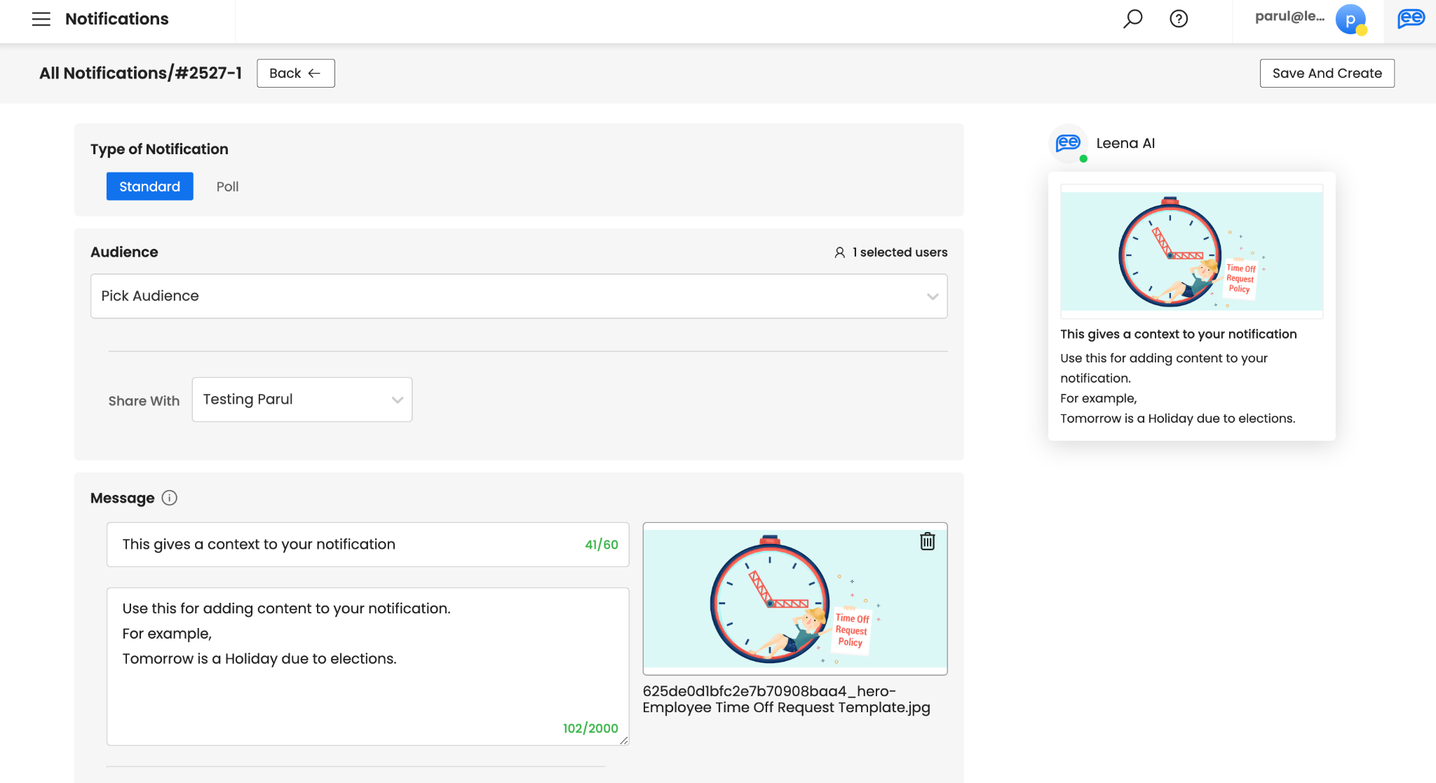 Create your Message. Subject can be a maximum of 60 characters. It is recommended to add a subject to give context to your notification. However, if you want to make this optional, connect with your Leena AI Project Team. Description of your message is used for adding content to your notification and hence, is mandatory. Please note default and recommend limit is 350 characters. However, you can get this increased up-to 2000 characters by connecting with your Leena AI Project Team.