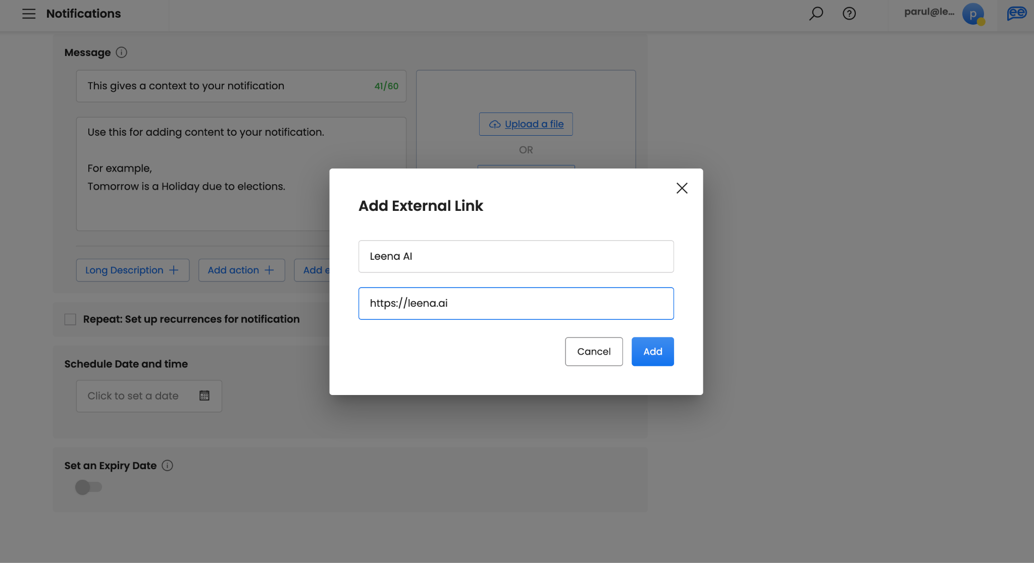 For External Links, you can provide a title and the link starting with https://. For example, you can give title as “Leena AI” and link as [https://leena.ai]. This will redirect the audience to provided link. You can provide a maximum of 1 external link per notification. However, it is not mandatory to add external link.