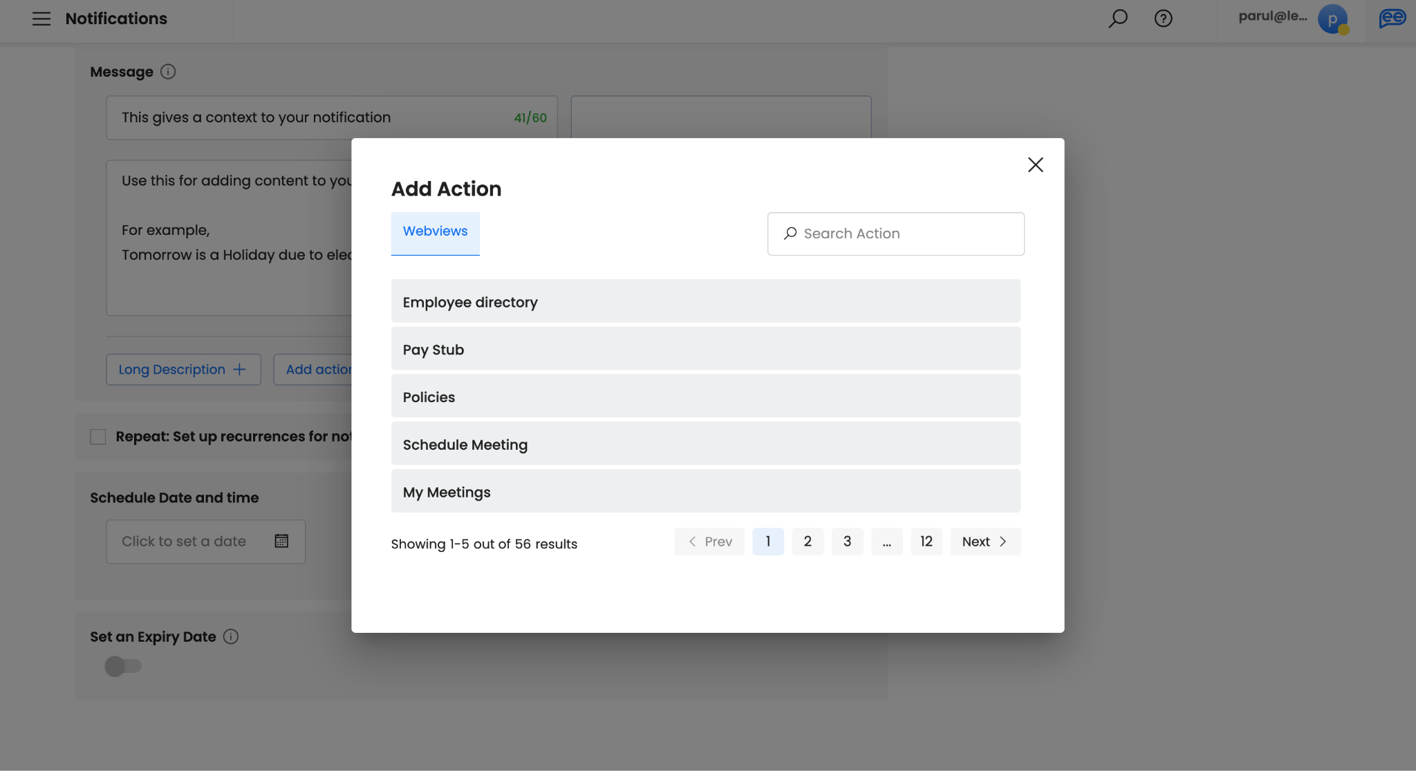 With Actions, you can choose Leena AI virtual assistant CTA. You can search for the action in the pop-up. You can choose a maximum of 3 actions. However, it is not mandatory to choose “action”. It is recommended when you notification promotes or requires a Leena AI virtual assistant action.