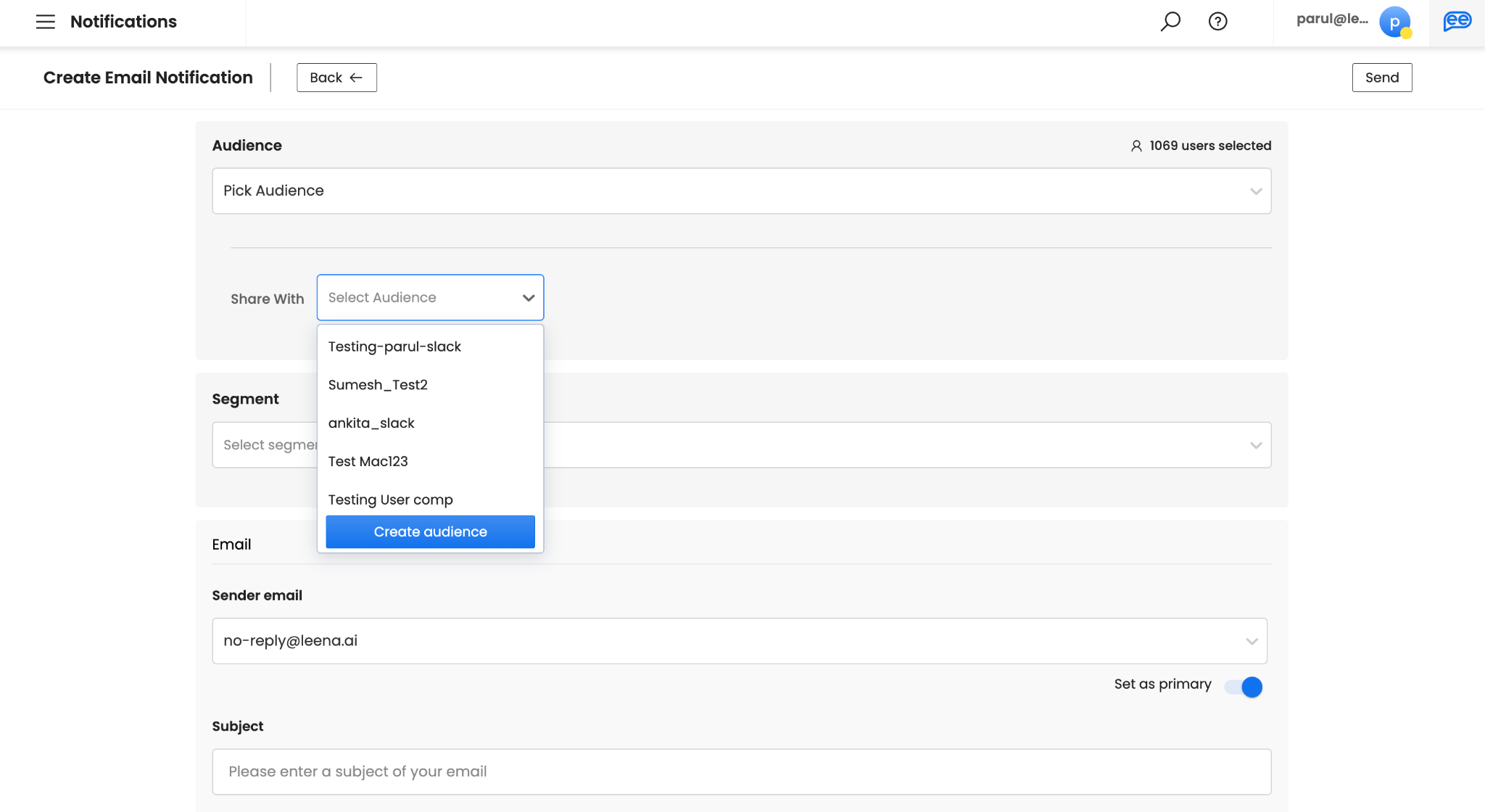 Select your Sender Email. Sender Email will list down all the configured email senders (authorized email IDs for sending your emails). To add more, please connect with your Leena AI Project Team. You can define a preferred Email Sender by opting for “Set as Primary”. However, you can always send your email notifications from any of the sender emails available in the drop down menu.