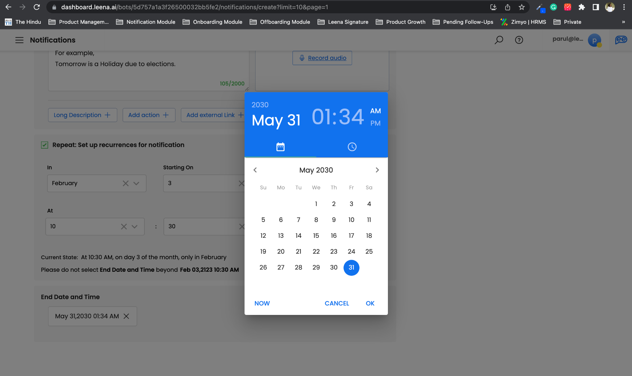 You can define your recurrence pattern by selecting a particular month, date, day of the week, and time. A recurrence pattern will automatically identify the schedule for the notifications based on your inputs and give a suggested End Date and Time for the 100th instance.