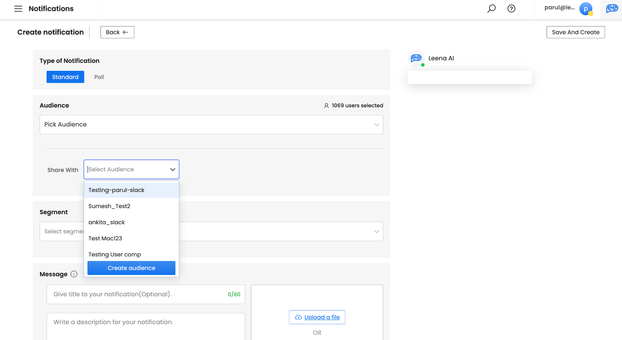 Once you click on Pick Audience, another option Share With will appear to choose your saved audiences. For creating a new audience, click on “Create Audience”. Refer Audience section for more details.