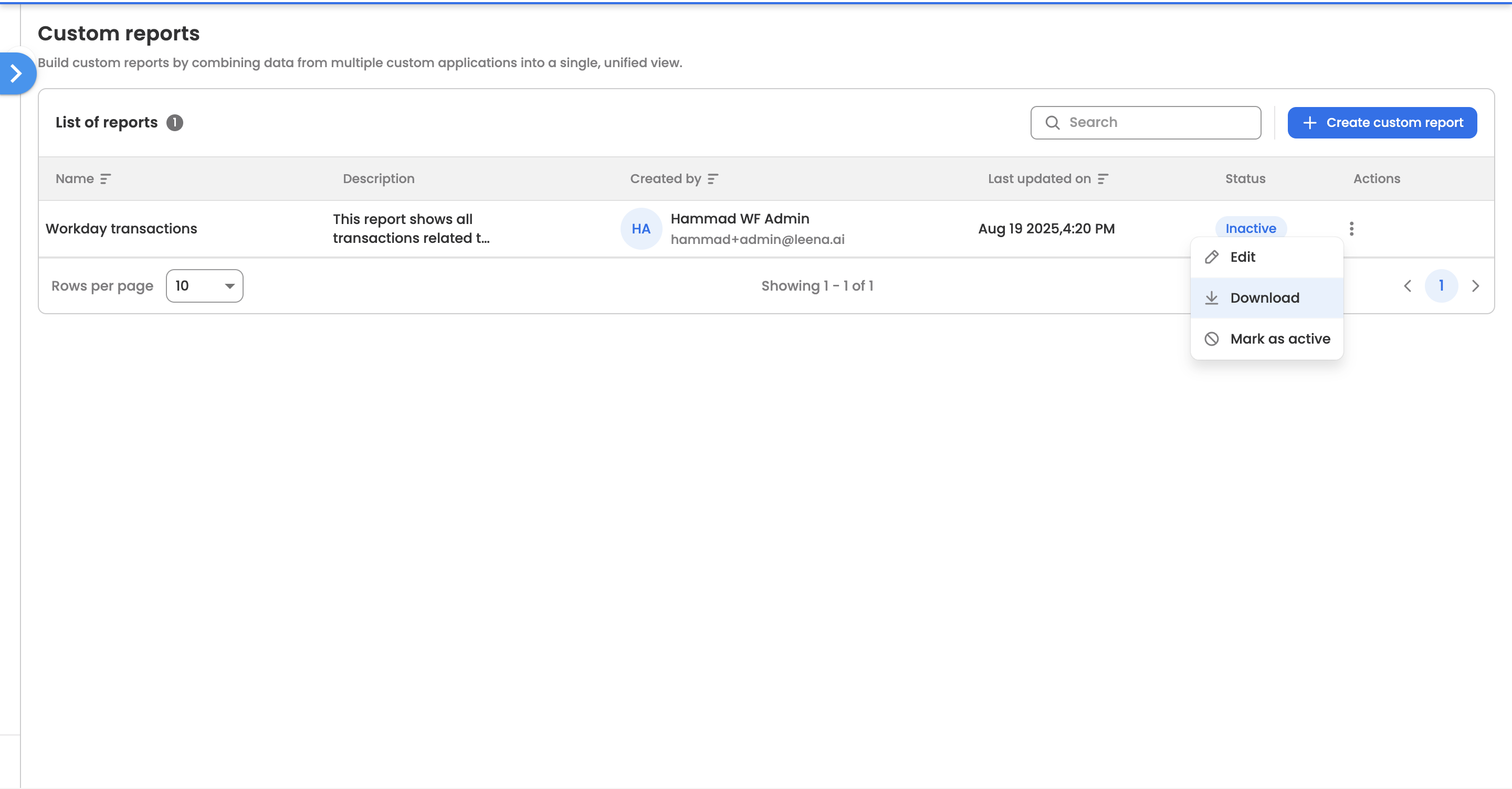 All Workflows Studio admins can download and edit custom reports, irrespective of the creator of a particular custom report.