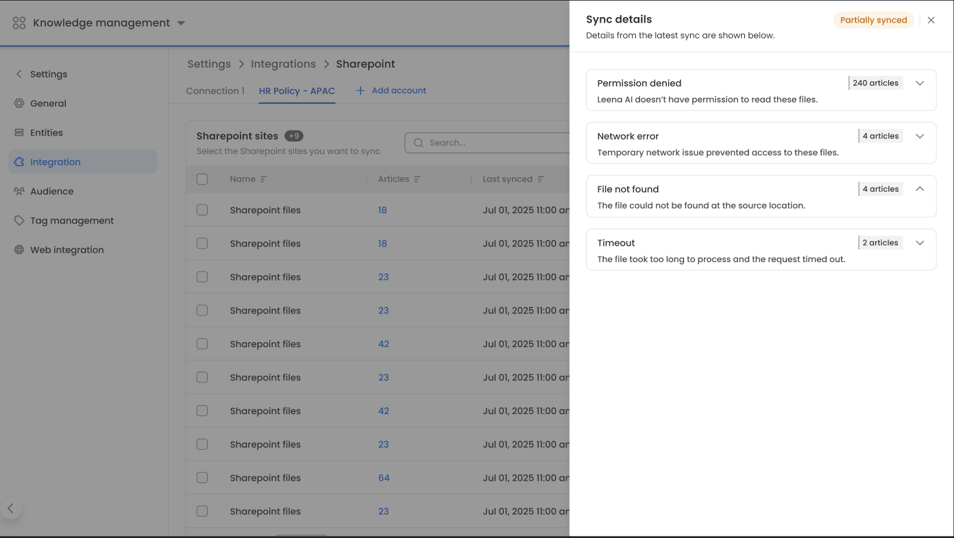 - Common Fixes: Granting "Read" access to the Leena AI service account or restoring files that were moved/deleted (
