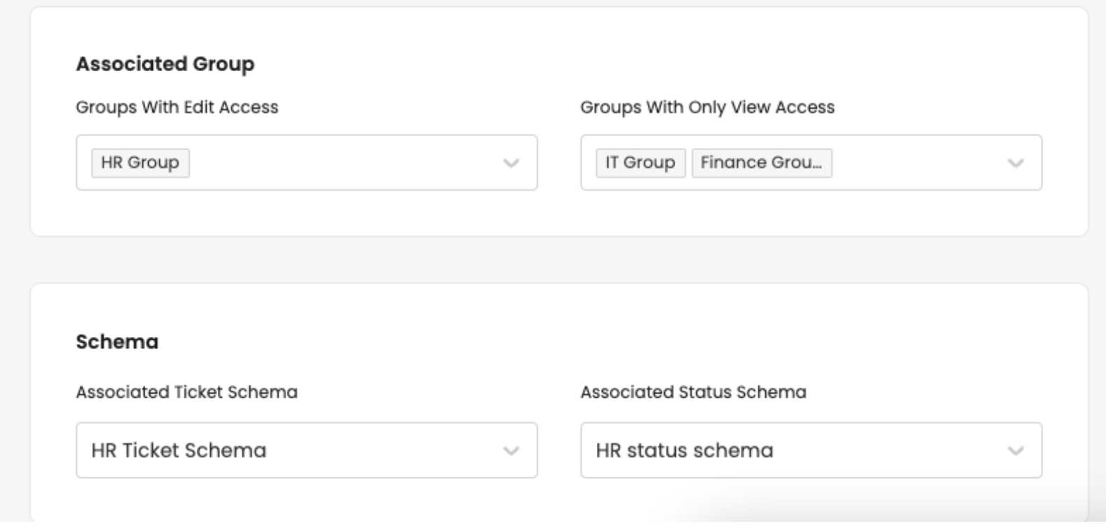 - Associated Ticket Schema (left) - This is a single select dropdown field where you can choose the ticket schema associated with the department. By default, the solution selects the default ticket schema, but you can choose a different one if needed too.