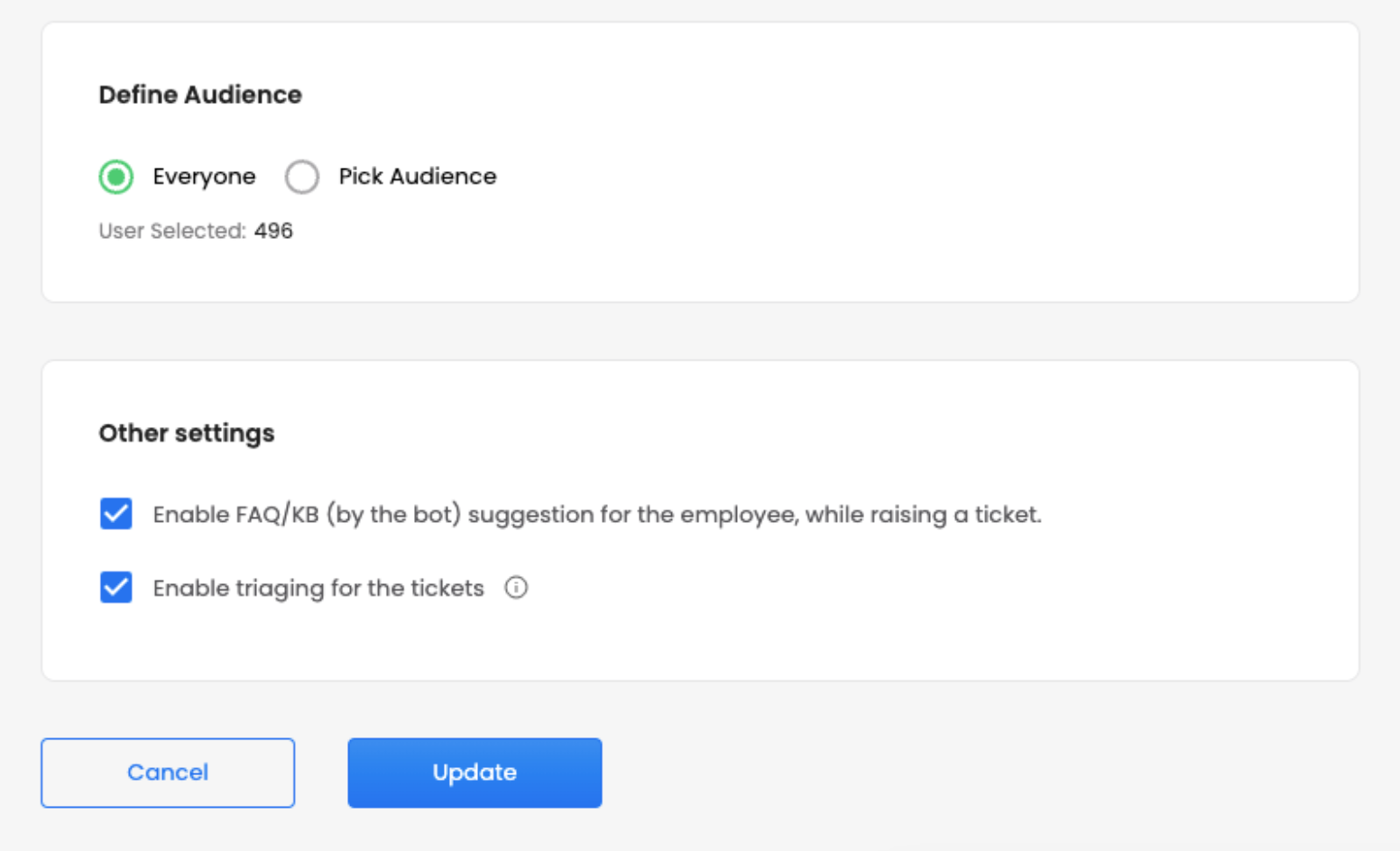 - FAQ/KB suggestion when raising a ticket - When a user raises a ticket with a query, the bot will search through the knowledge base to suggest possible resolutions based on the user's query.
